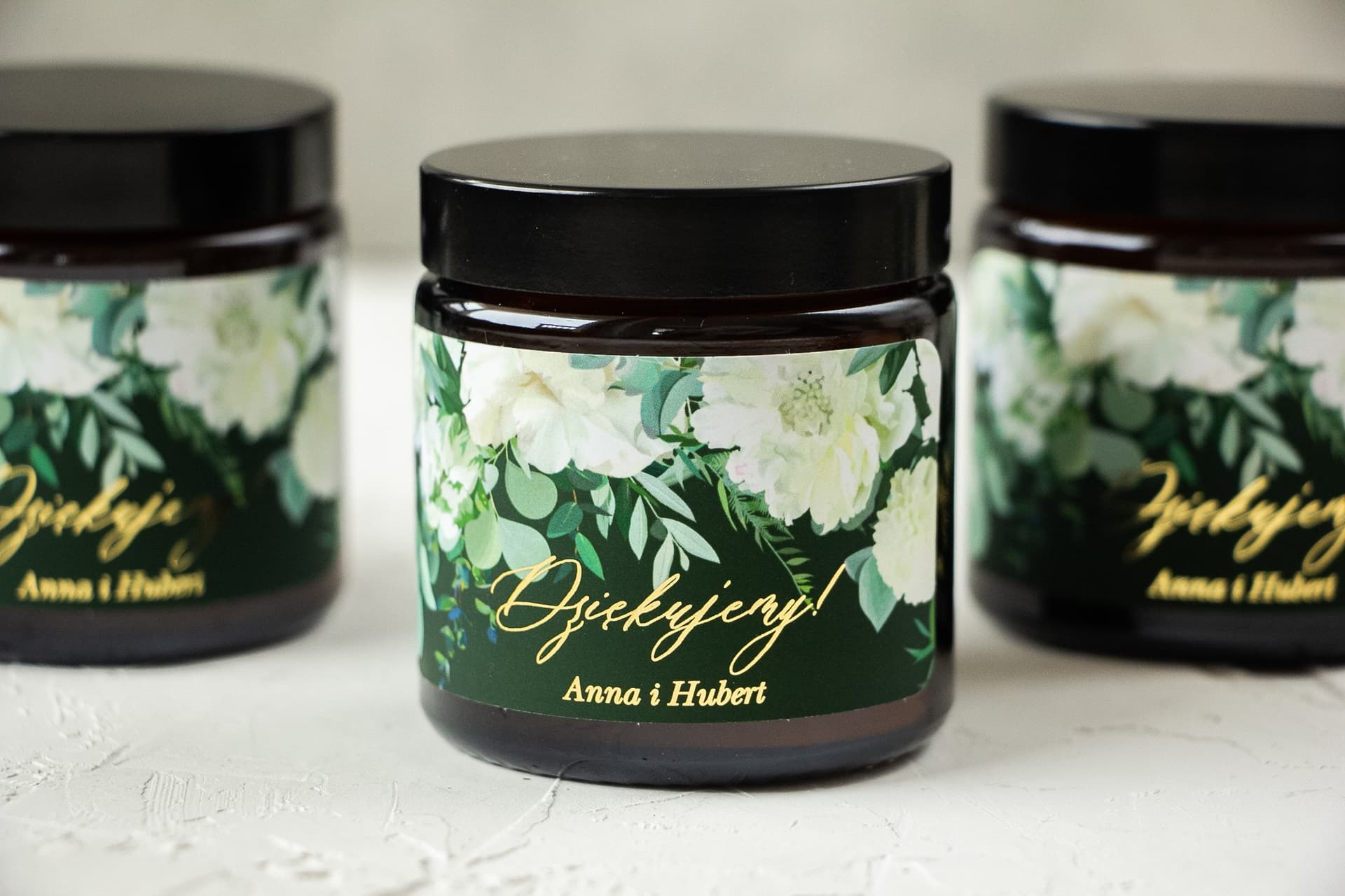 Podziękujcie gościom w niezapomniany sposób, wręczając im eleganckie świeczki sojowe z personalizowaną etykietą. Każda świeca, zamknięta w stylowym słoiczku z brązowego szkła, zachwyca motywem białych piwonii na tle butelkowej zieleni i złoconymi napisami. To luksusowy i ekologiczny upominek weselny, wykonany z naturalnego wosku sojowego, który na długo pozostanie w pamięci. Wybierzcie jeden z wyjątkowych zapachów i stwórzcie idealną pamiątkę, która dopełni Waszą uroczystość. Odkryjcie magię personalizowanych podziękowań już dziś!