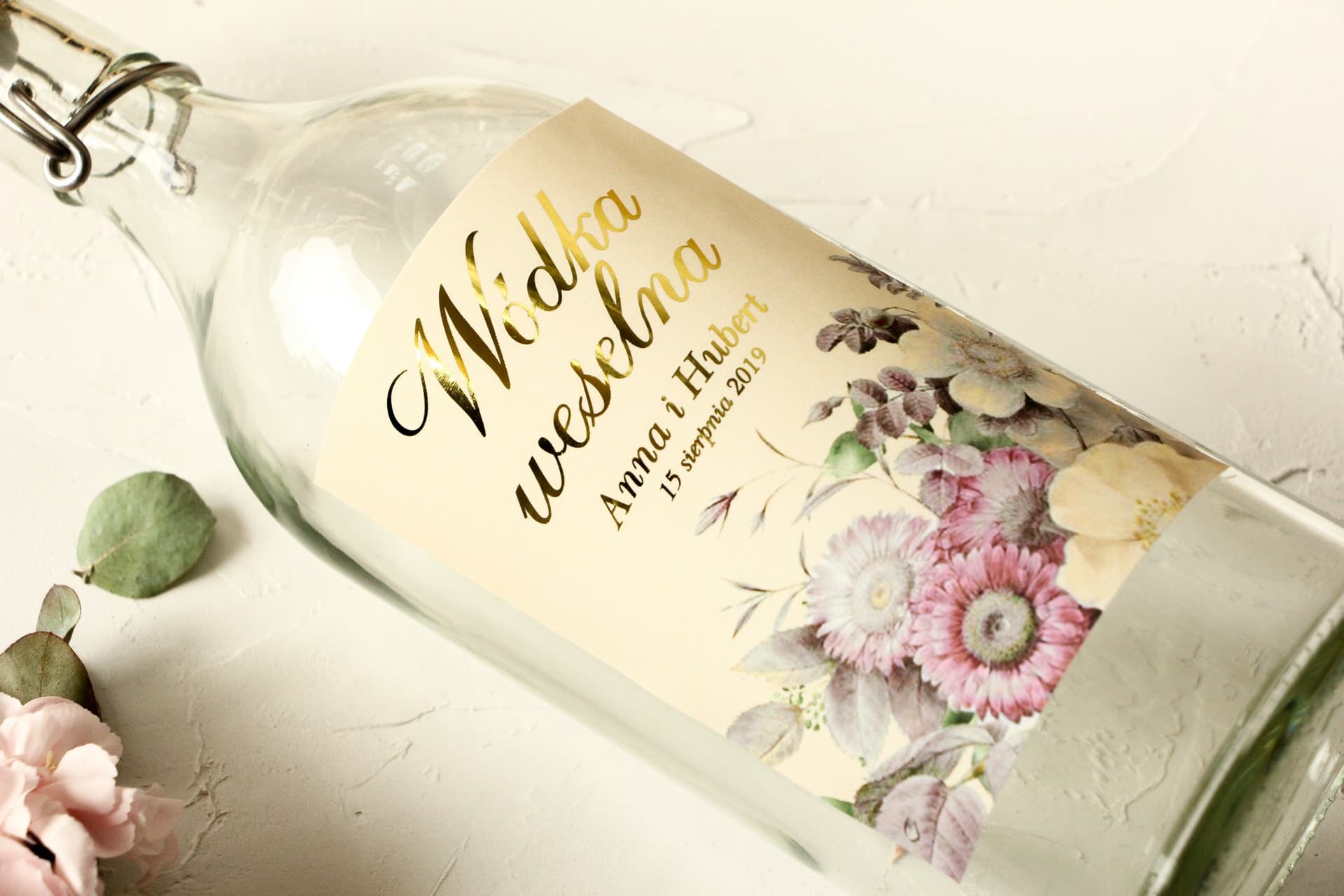 Złocone Etykiety z Kwiatami | Personalizowane Naklejki na Wódkę Weselną | Szafirowe nr 1