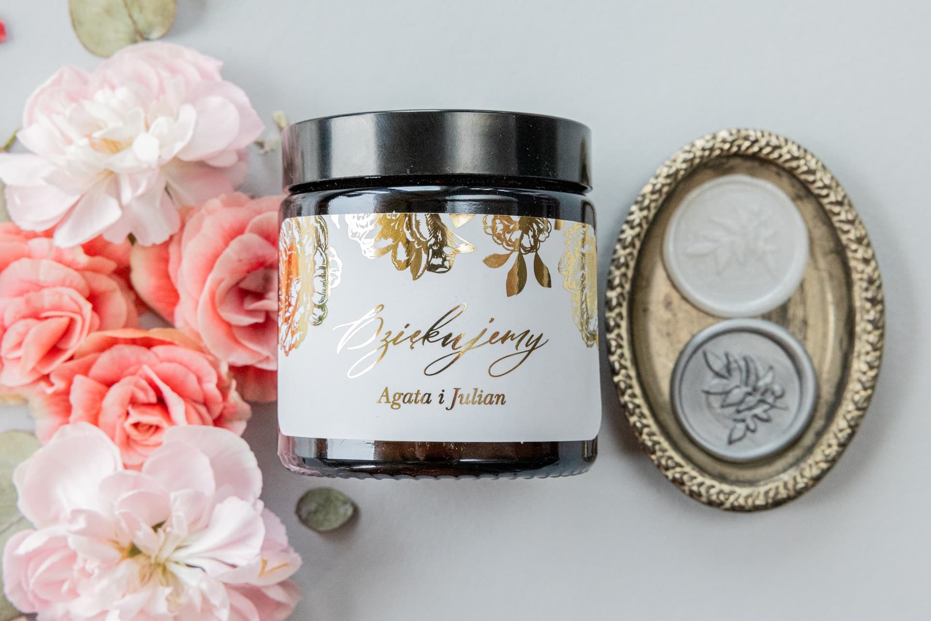 Wiemy, jak ważna jest spójność i dbałość o detale w dniu ślubu. Dlatego oferujemy pełną personalizację etykiet na naszych świeczkach. Możecie umieścić na nich swoje imiona, datę uroczystości, krótkie podziękowanie lub dowolny tekst, który sprawi, że upominek będzie naprawdę Wasz. Nasz zespół grafików, wspierany przez nowoczesne narzędzia AI, przygotuje dla Was darmowy projekt, a Wy możecie zgłaszać nielimitowaną liczbę poprawek, aż do uzyskania wymarzonego efektu. Etykieta ze złotą, połyskującą grafiką piwonii doskonale komponuje się z papeterią w stylu glamour. Zastanawiacie się, jakie teksty umieścić na zaproszeniach ślubnych i dodatkach? Zainspirujcie się na naszym blogu i stwórzcie spójną całość.