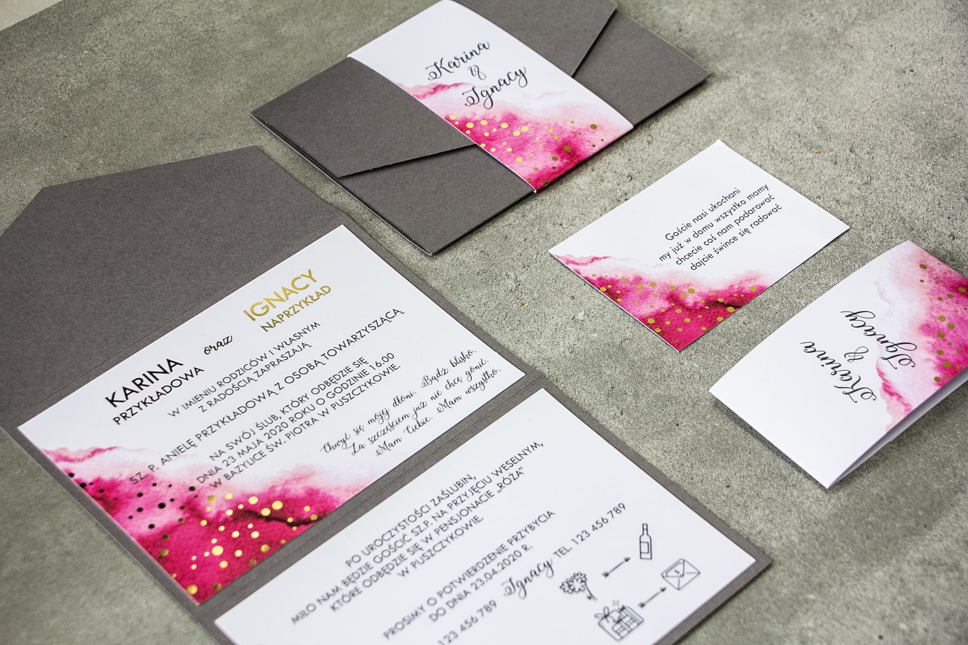 Zestaw próbek zaproszeń ślubnych w odcieniach szarości i różu ze złotymi kropkami Bakarto nr 3