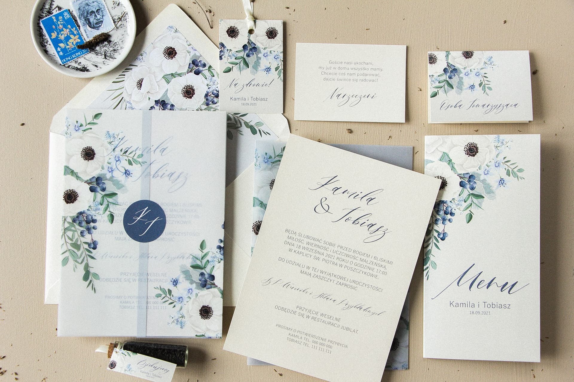 Próbka zaproszenia ślubnego z anemonami i błękitem Opal nr 7
