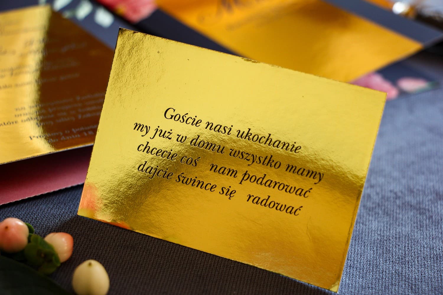 - Informacje o poprawinach: Jeśli planujecie drugi dzień wesela, krótka notka na wkładce będzie najlepszym zaproszeniem.