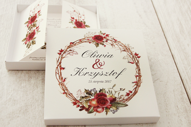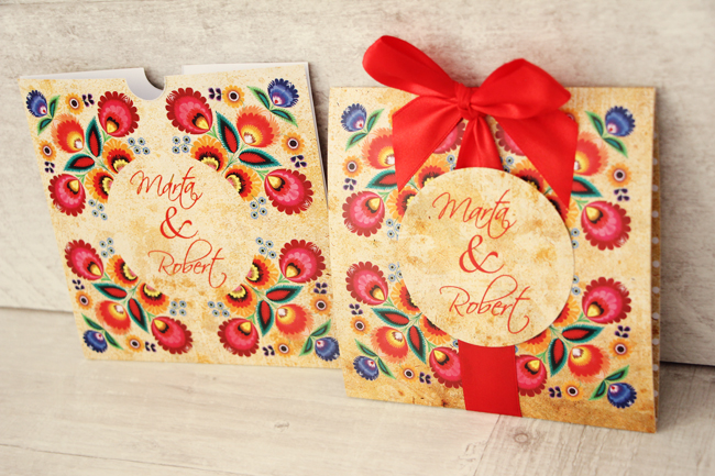 Folkowe wzory to przede wszystkim piękne i żywe kolory, które cudownie prezentują się na weselnych stołach. Zaproszenia w eleganckim pudełku....
