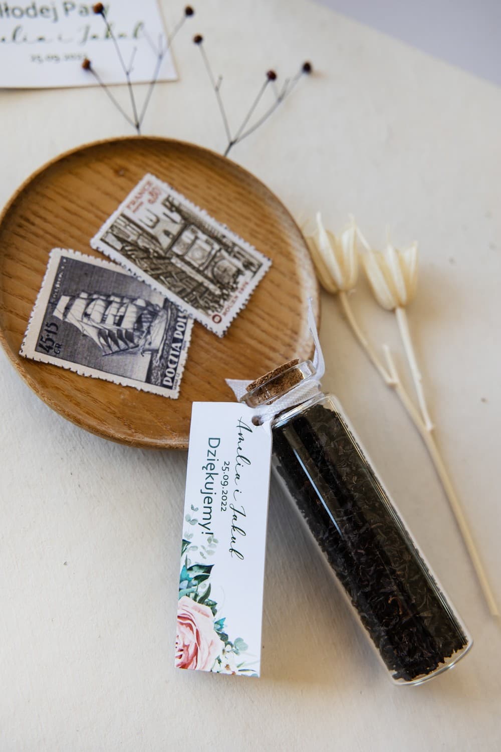 Wyobraźcie sobie uśmiech na twarzach Waszych gości, gdy otrzymają ten uroczy drobiazg. Szklana fiolka o wymiarach 72 x 22 mm, zamknięta naturalnym korkiem, kryje w sobie aromatyczną, liściastą herbatę. To nie tylko piękny, ale i praktyczny prezent – zaproszenie do chwili relaksu i wspomnień o Waszym wyjątkowym dniu przy filiżance pysznego naparu. Każdy detal został starannie przemyślany, aby stworzyć spójną i elegancką całość, która będzie doskonałą dekoracją weselnego stołu.