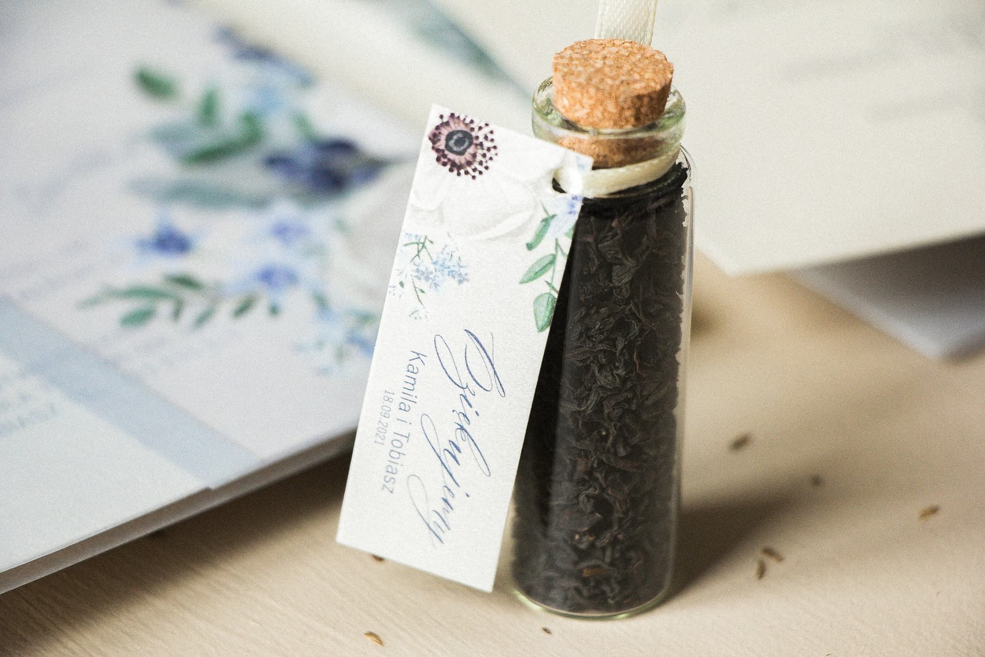 Szukasz wyjątkowych podziękowań dla gości weselnych? Nasze buteleczki z herbatą z kolekcji Opal to strzał w dziesiątkę! Każda szklana fiolka kryje w sobie aromatyczną herbatę, a dołączona przywieszka z perłowego papieru z subtelnym motywem białych zawilców dodaje całości elegancji. To idealny, spersonalizowany upominek, który na długo pozostanie w pamięci Waszych bliskich. Podziękuj swoim gościom w niebanalny sposób i stwórzcie razem piękne wspomnienia. Sprawdź i zamów już teraz!