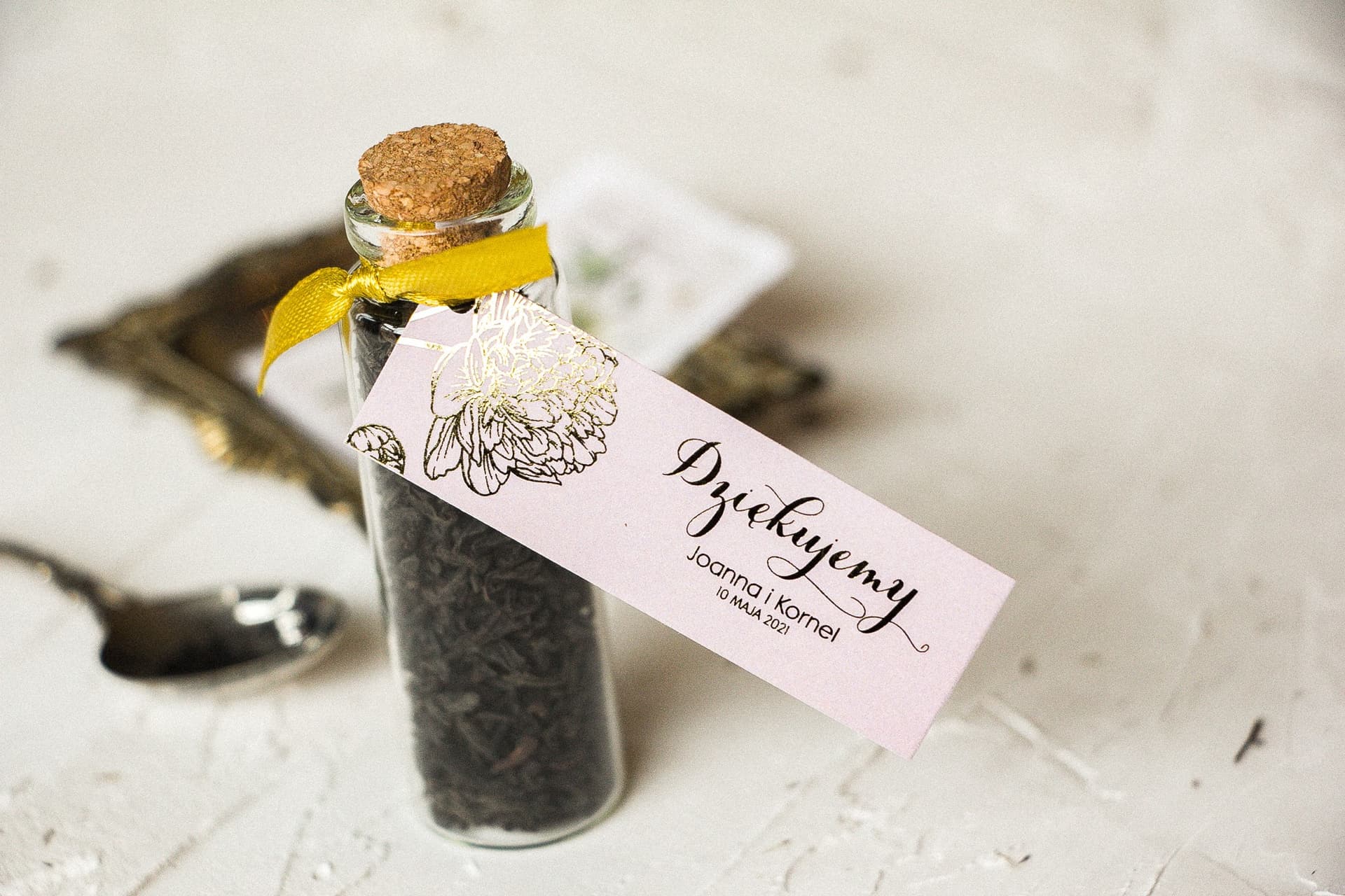 Szukasz wyjątkowego sposobu, by podziękować gościom za obecność? Nasze buteleczki z aromatyczną herbatą liściastą to idealne rozwiązanie. Każda fiolka ozdobiona jest personalizowaną przywieszką z eleganckim motywem piwonii i subtelnymi złoceniami, co dodaje jej luksusowego charakteru. To nie tylko piękny, ale i praktyczny upominek, który na długo pozostanie w pamięci Twoich bliskich. Sprawdzi się doskonale jako podziękowanie na ślubie, chrzcinach czy komunii. Zamów i zachwyć swoich gości!