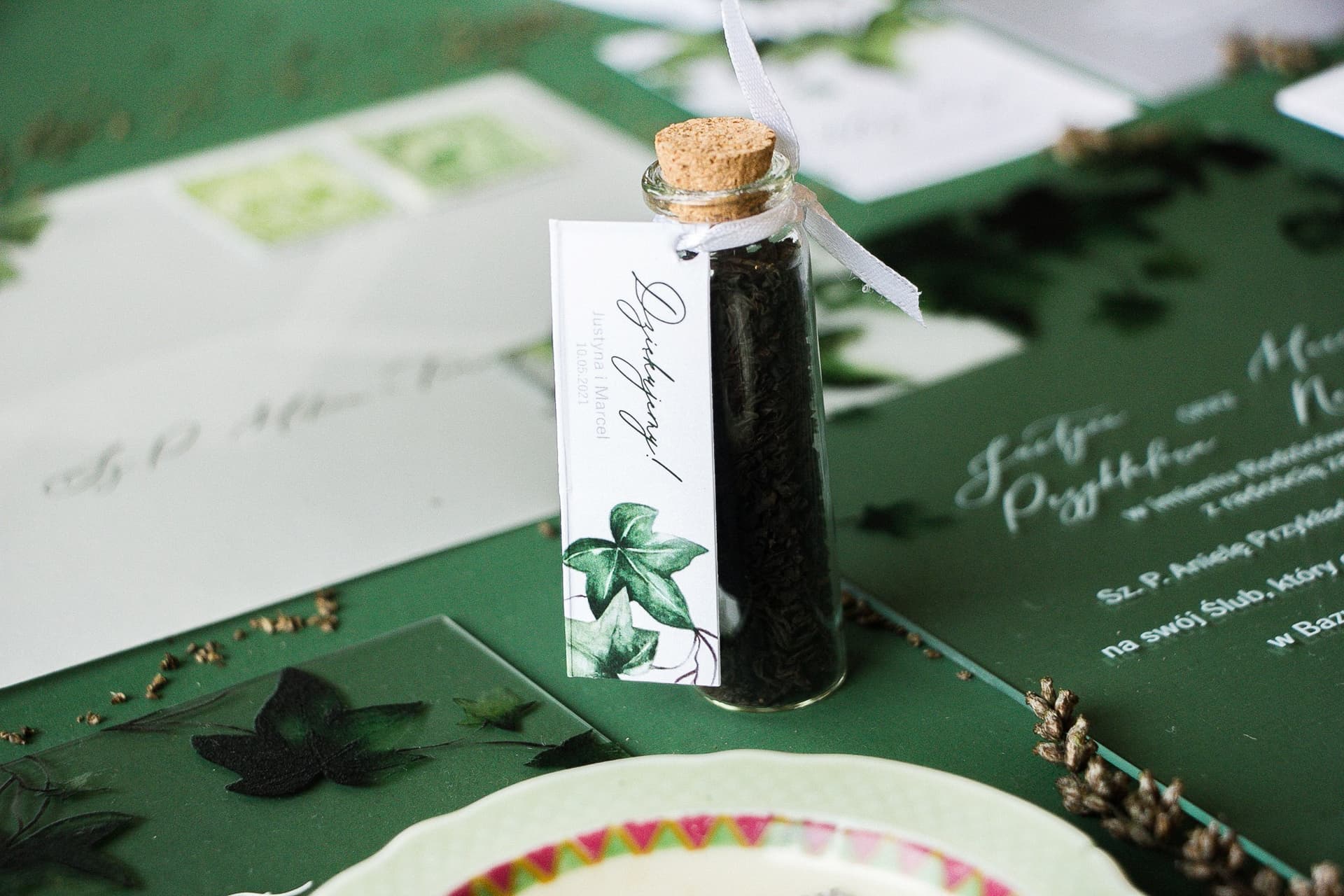 Kluczem do spektakularnego efektu wizualnego jest spójność. Nasze buteleczki z herbatą to część większej kolekcji papeterii ślubnej Soft nr 2. Oznacza to, że możecie zamówić w tym samym, pięknym stylu z motywem bluszczu również zaproszenia ślubne, winietki na stoły, zawieszki na alkohol, menu weselne, a nawet księgę gości. Taka konsekwencja w doborze dodatków zachwyci Waszych gości i stworzy profesjonalny, dopracowany wizerunek całej uroczystości. Pamiętajcie, że odpowiednie upominki dla gości weselnych to ważny element, który pokazuje, jak bardzo chcecie o nich zadbać.