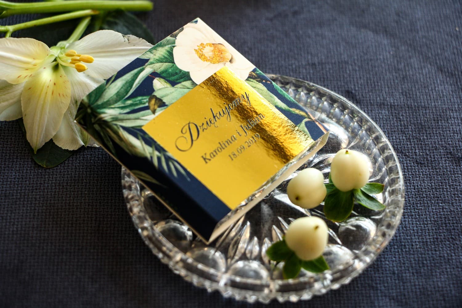 Wybierz wyjątkowe podziękowania dla gości weselnych w formie pysznych, mlecznych czekoladek. Każda sztuka otulona jest w eleganckie, granatowo-złote opakowanie z subtelnym motywem białej kamelii, które zachwyci Twoich bliskich. Dzięki bezpłatnej personalizacji, umieścisz na nich Wasze imiona i datę ślubu, tworząc niepowtarzalną pamiątkę. Zamów już dziś i podaruj gościom słodki upominek, który podkreśli wyjątkowy charakter Waszej uroczystości i na długo pozostanie w ich pamięci.