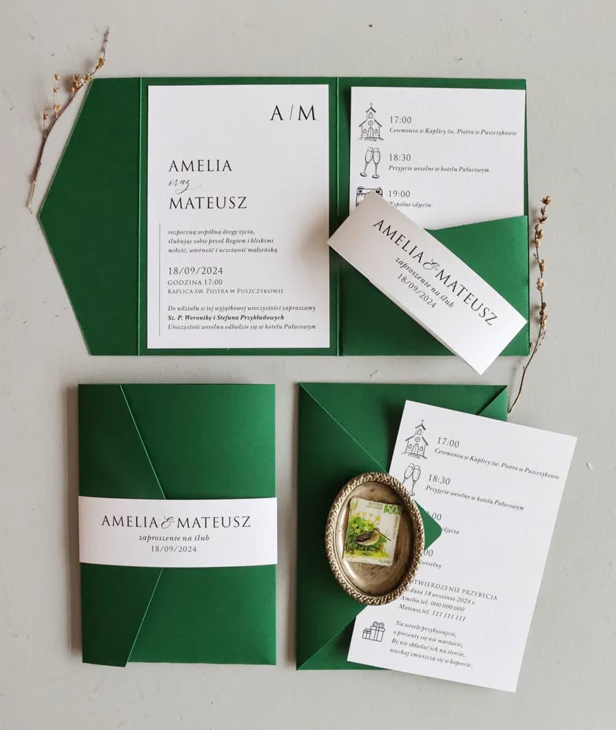 Wybór koloru przewodniego to jedna z kluczowych decyzji w planowaniu ślubu. Motyw weselny butelkowa zieleń to trend, który od kilku sezonów nie traci na popularności, oferując niezwykłą wszechstronność. Pasuje zarówno do uroczystości w stylu glamour, rustykalnym, jak i nowoczesnym. Nasze zaproszenia ślubne w odcieniach butelkowej zieleni stanowią doskonałą bazę do stworzenia spójnej aranżacji. Ten głęboki, nasycony kolor pięknie komponuje się ze złotem, bielą, a także naturalnymi materiałami, takimi jak drewno czy len, z którego wykonana jest owijka w modelu Kraft nr 10.