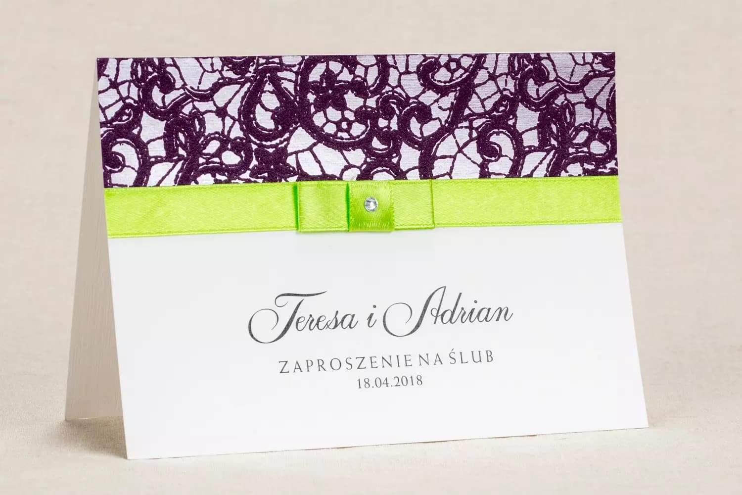 To, co wyróżnia ten projekt, to odważne i niezwykle stylowe połączenie fioletowej koronki z soczyście zieloną, satynową kokardką. Zieleń to kolor nadziei, natury, nowego początku i harmonii – wszystkiego, co symbolizuje start wspólnej drogi życiowej. Kontrast pomiędzy głębokim fioletem a żywą zielenią przyciąga wzrok, intryguje i sprawia, że zaproszenie jest dynamiczne i pełne życia. To detal, który świadczy o dbałości o szczegóły i odwadze w kreowaniu własnego, niepowtarzalnego stylu.