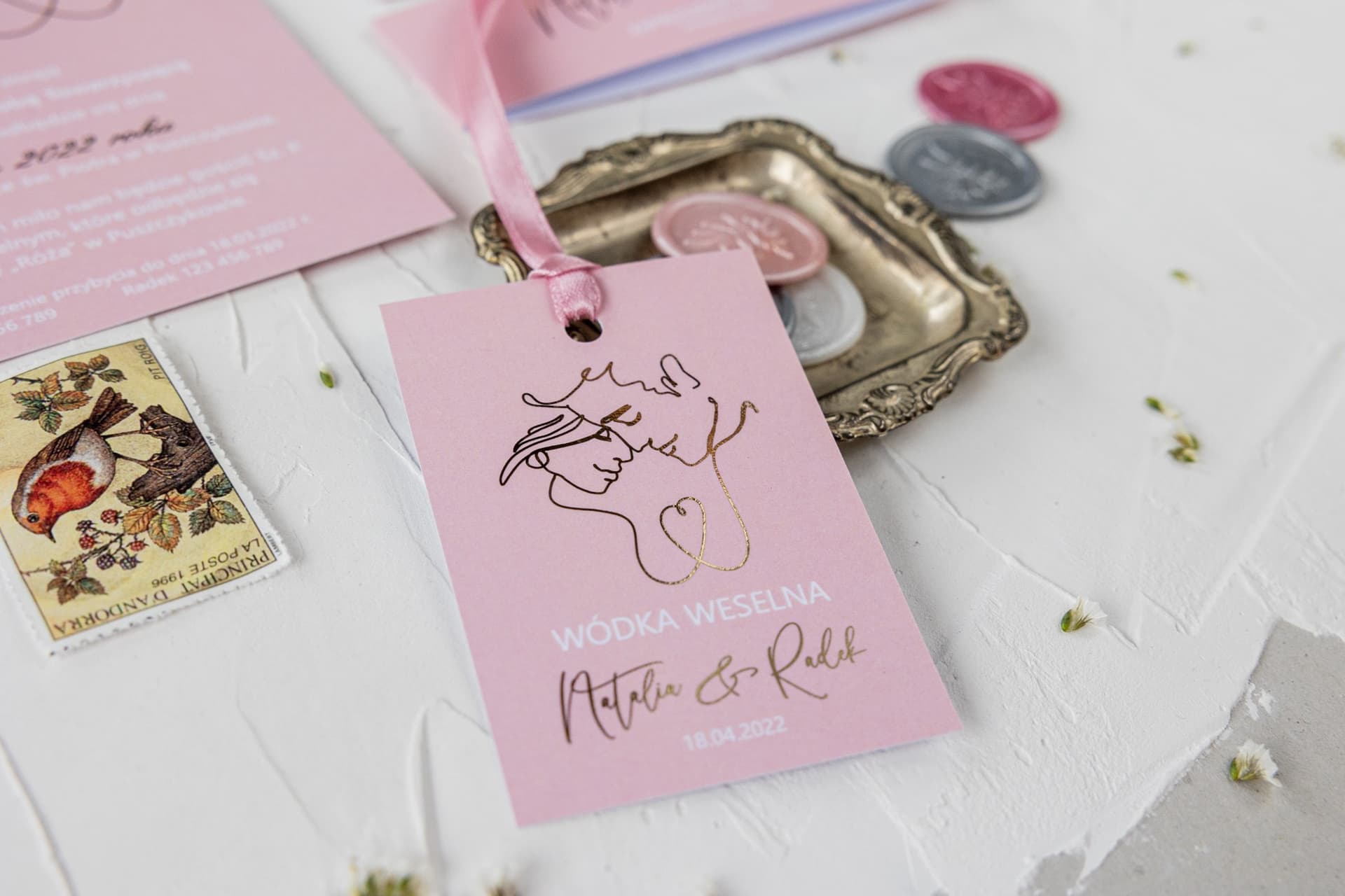 Tym, co wyróżnia kolekcję Jaspis, jest przepiękne, lśniące złocenie. Napisy na zawieszkach wykonujemy metodą hot-stampingu, która gwarantuje intensywny, lustrzany blask i precyzyjne krawędzie. Złote litery pięknie kontrastują z bielą papieru i pudrowym różem kwiatowej grafiki, tworząc kompozycję w stylu glamour. Delikatne kwiaty, zdobiące przywieszkę, dodają jej romantyzmu i lekkości, idealnie wpisując się w najnowsze trendy ślubne. Niezależnie od tego, czy planujesz wesele w stylu klasycznym, nowoczesnym czy romantycznym, te zawieszki na alkohol ze złoceniem będą doskonałym uzupełnieniem aranżacji.
