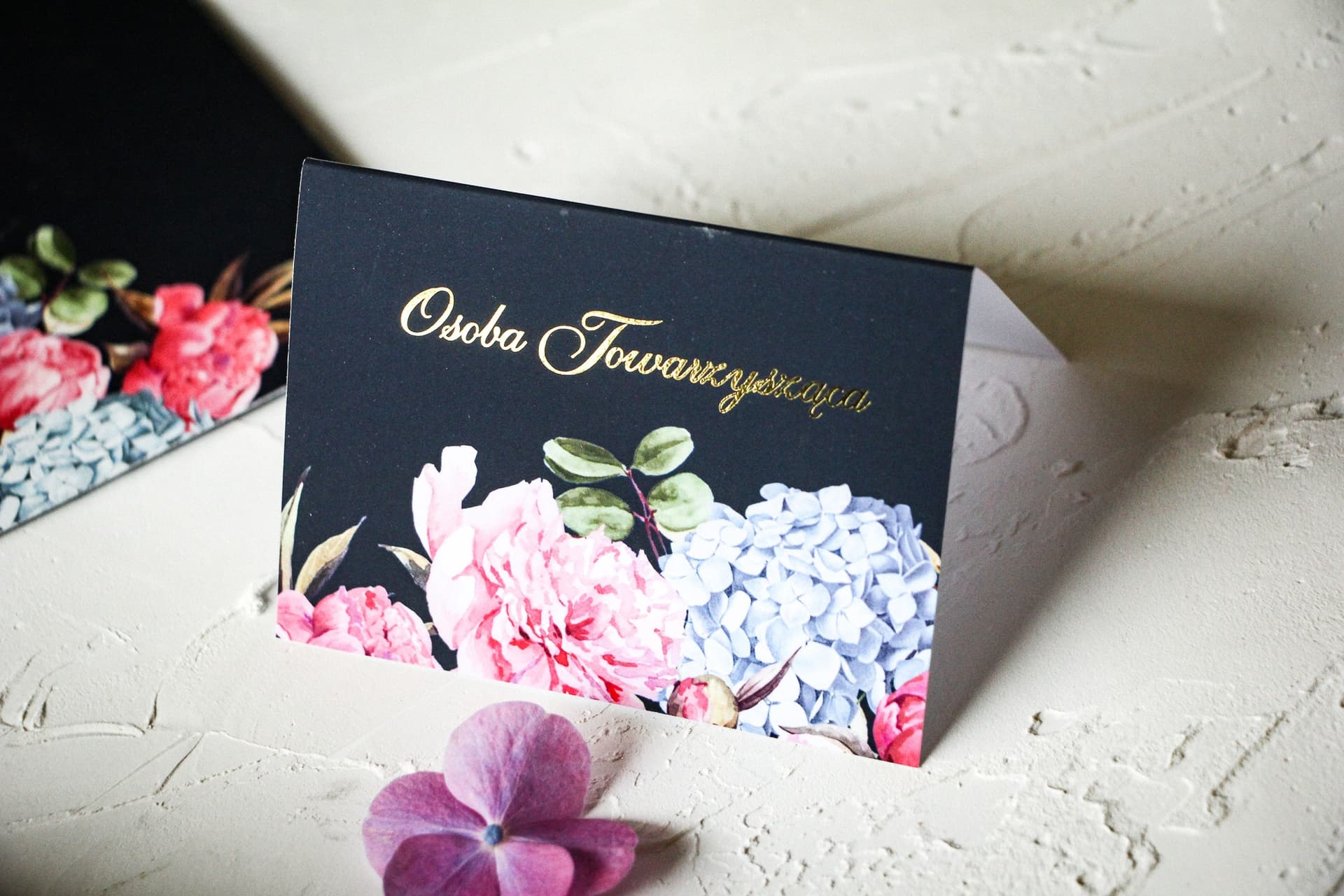 Eleganckie winietki ślubne ze złoconymi nazwiskami gości to kwintesencja stylu glamour na Twoim weselu. Bukiet różowych piwonii i błękitnych hortensji na głębokim, granatowym tle tworzy niezapomnianą kompozycję. Wykonane na sztywnym, satynowym papierze 280g, gwarantują luksusowy wygląd i trwałość. Wskaż gościom ich miejsca z klasą i dodaj stołom weselnym wyrafinowanego charakteru. Zamów spersonalizowane winietki z darmowym projektem i stwórz spójną aranżację przyjęcia, która zachwyci wszystkich obecnych!