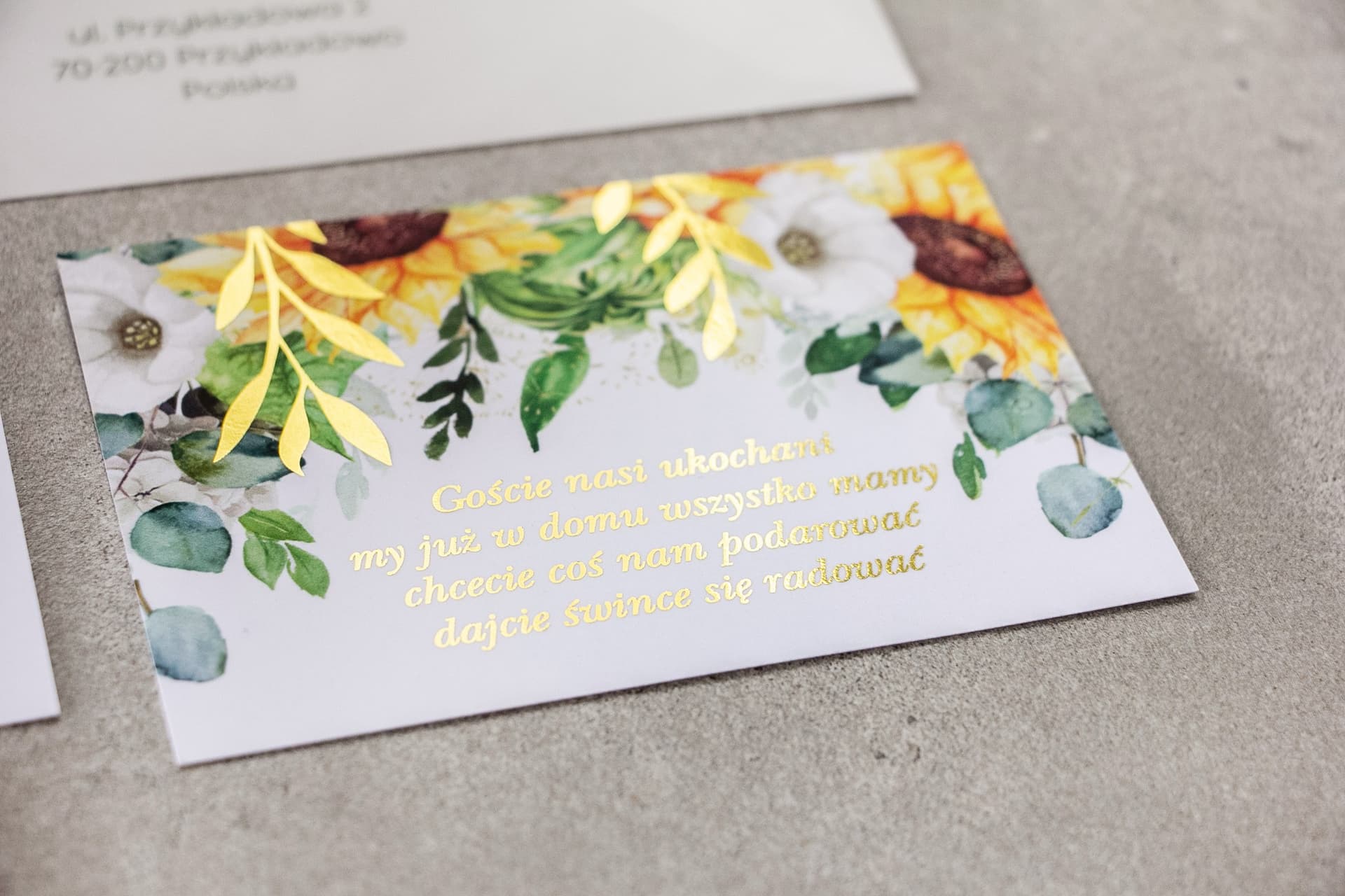 Każdy detal ma znaczenie, zwłaszcza gdy planujecie ten jedyny, wymarzony dzień. Zaproszenia ślubne to wizytówka Waszej uroczystości, ale to właśnie dodatki, takie jak bileciki informacyjne, świadczą o najwyższej dbałości o komfort gości. Prezentujemy eleganckie i pełne letniego słońca wkładki do zaproszeń z kolekcji Rubin nr 7 – idealne połączenie ciepłego motywu słonecznika z luksusowym blaskiem złota. To nie tylko piękny dodatek, ale przede wszystkim praktyczne narzędzie, które ułatwi organizację i komunikację z Waszymi bliskimi.