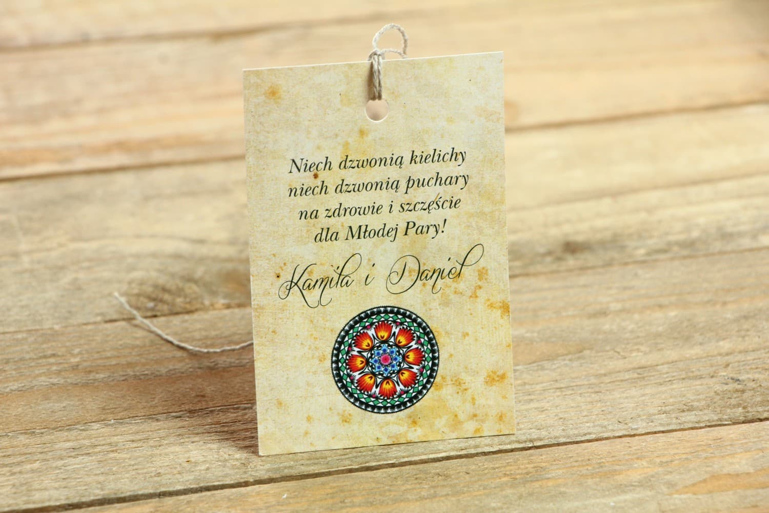 W Amelia-Wedding.pl wierzymy, że diabeł tkwi w szczegółach. Dlatego nasze zawieszki na wódkę weselną Folk nr 1 zostały zaprojektowane i wykonane z najwyższą starannością. Podstawą jest wysokiej jakości, gruby papier satynowy o gramaturze 280g. Jest on nie tylko sztywny i wytrzymały, ale także ma gładką, przyjemną w dotyku powierzchnię, która doskonale eksponuje nasycone, żywe kolory folklorystycznego wzoru. Nadruk jest precyzyjny i trwały, dzięki czemu zawieszki prezentują się nienagannie przez całą noc, nawet w dynamicznych warunkach weselnej zabawy.