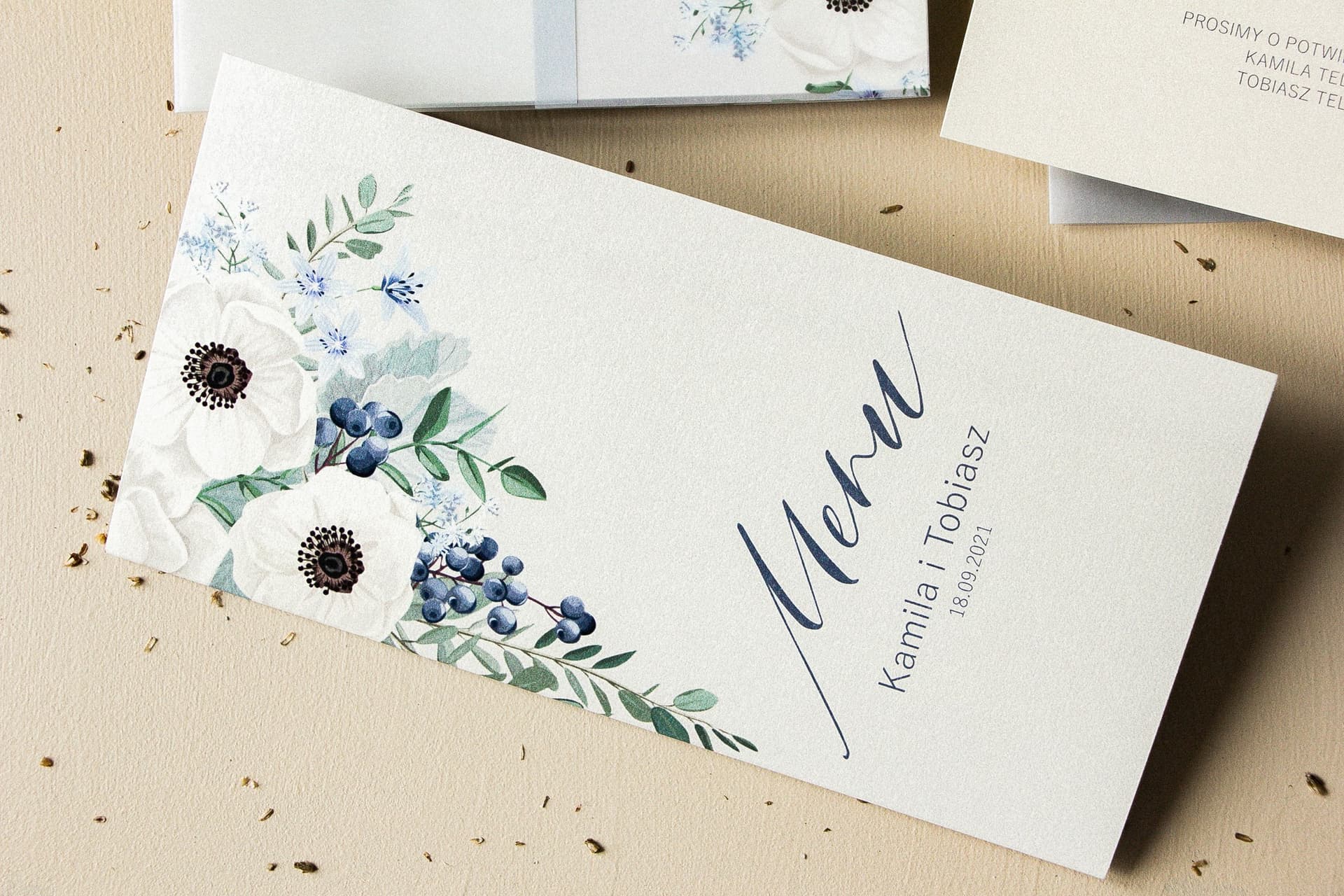 Menu Opal Nr 7 to synonim subtelności i klasy, idealny dla par ceniących detale i elegancję. Perłowy papier w kolorze ecru o gramaturze 300g stanowi tło dla pięknej kompozycji białych zawilców, tworząc niepowtarzalną atmosferę na każdym stole weselnym. Subtelna grafika i delikatne barwy harmonijnie współgrają z każdym motywem dekoracyjnym, dodając uroczystości wyjątkowego charakteru.