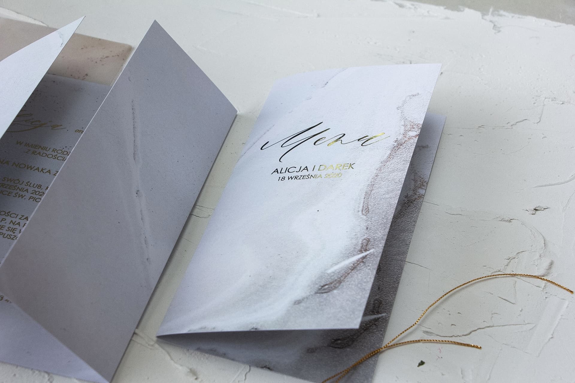 Zaproszenie do Świata Pełnego Piękna: Wybierając Menu Marmurowe Nr 1, decydujecie się nie tylko na ekskluzywne menu, ale także na wejście do świata pełnego piękna i spójności. Oferujemy szeroką gamę papeterii ślubnej, od zaproszeń po podziękowania dla gości, wszystko utrzymane w jednym, harmonijnym stylu. Każdy element jest starannie zaprojektowany, aby dopełnić magię Waszego ślubu, tworząc wspomnienia, które będą żyć przez lata.