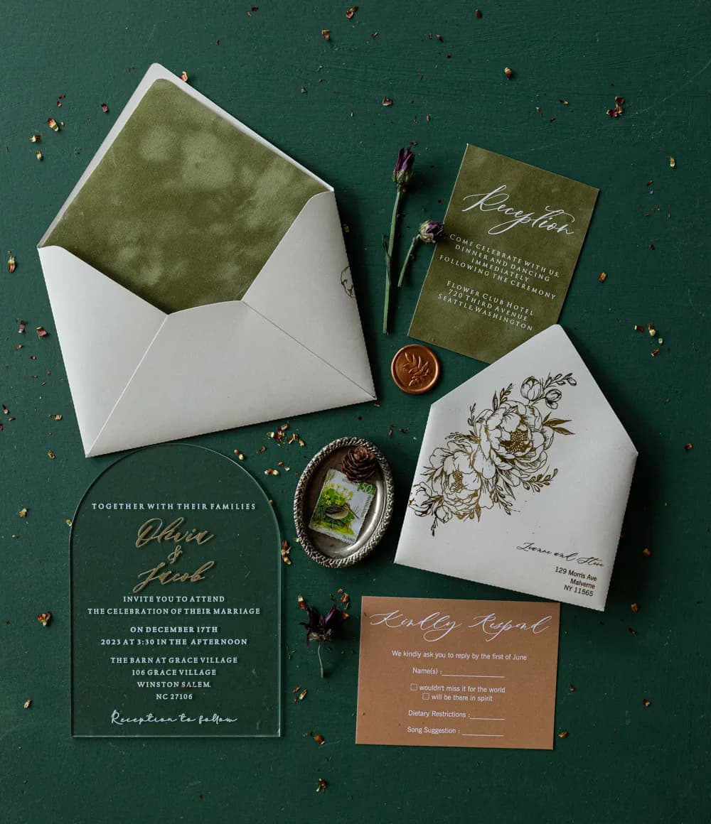 Poczuj magię luksusu z naszymi zaproszeniami na przezroczystej pleksi w modnym kształcie łuku. Złocone imiona Pary Młodej dodają blasku, a unikalna koperta w kolorze kości słoniowej z welurowym, zielonym wnętrzem podkreśla wyjątkowy charakter uroczystości. To idealny wybór dla par ceniących nowoczesną elegancję i najwyższą jakość. Zamów spersonalizowany projekt i zachwyć swoich gości już od pierwszego wrażenia! Skorzystaj z darmowego projektu i nieograniczonej liczby poprawek.