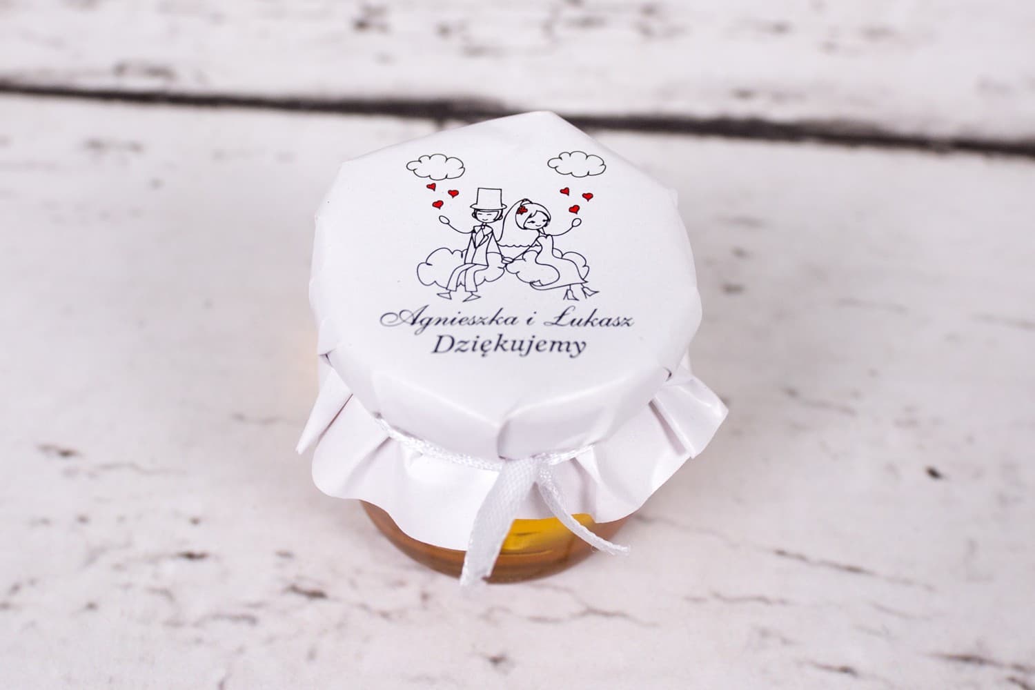 Szukacie wyjątkowego sposobu, by podziękować gościom za przybycie? Nasze słodkie podziękowania dla gości w formie słoiczka pysznego, polskiego miodu wielokwiatowego to strzał w dziesiątkę. Urocza grafika z zakochaną parą w chmurach i możliwość pełnej, darmowej personalizacji sprawią, że ten upominek na długo zapadnie w pamięć. To więcej niż miód – to małe dzieło sztuki, które idealnie dopełni Waszą uroczystość. Stwórzcie niepowtarzalną pamiątkę dla swoich bliskich!