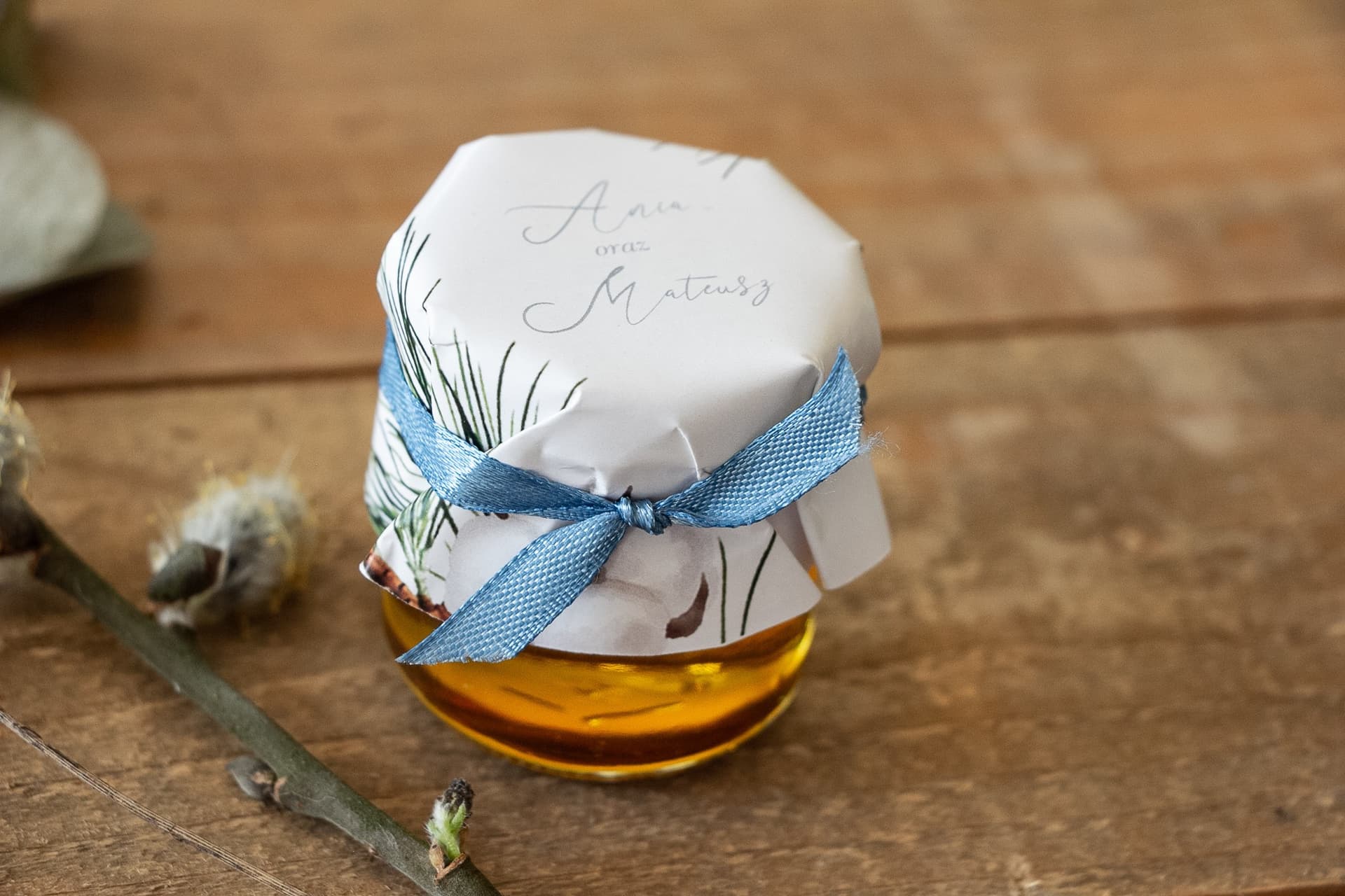 Oczaruj swoich gości wyjątkowym podziękowaniem w postaci naturalnego miodu wielokwiatowego. Każdy słoiczek (50g) zdobi elegancki kapturek z unikalną grafiką iglaków i bawełny, idealnie wpisującą się w styl rustykalny, leśny czy zimowy. To nie tylko słodki upominek, ale i piękna pamiątka Waszego wielkiego dnia. Oferujemy pełną, darmową personalizację projektu, aby idealnie pasował do motywu przewodniego wesela. Podziękuj bliskim w sposób, który zapamiętają na długo.