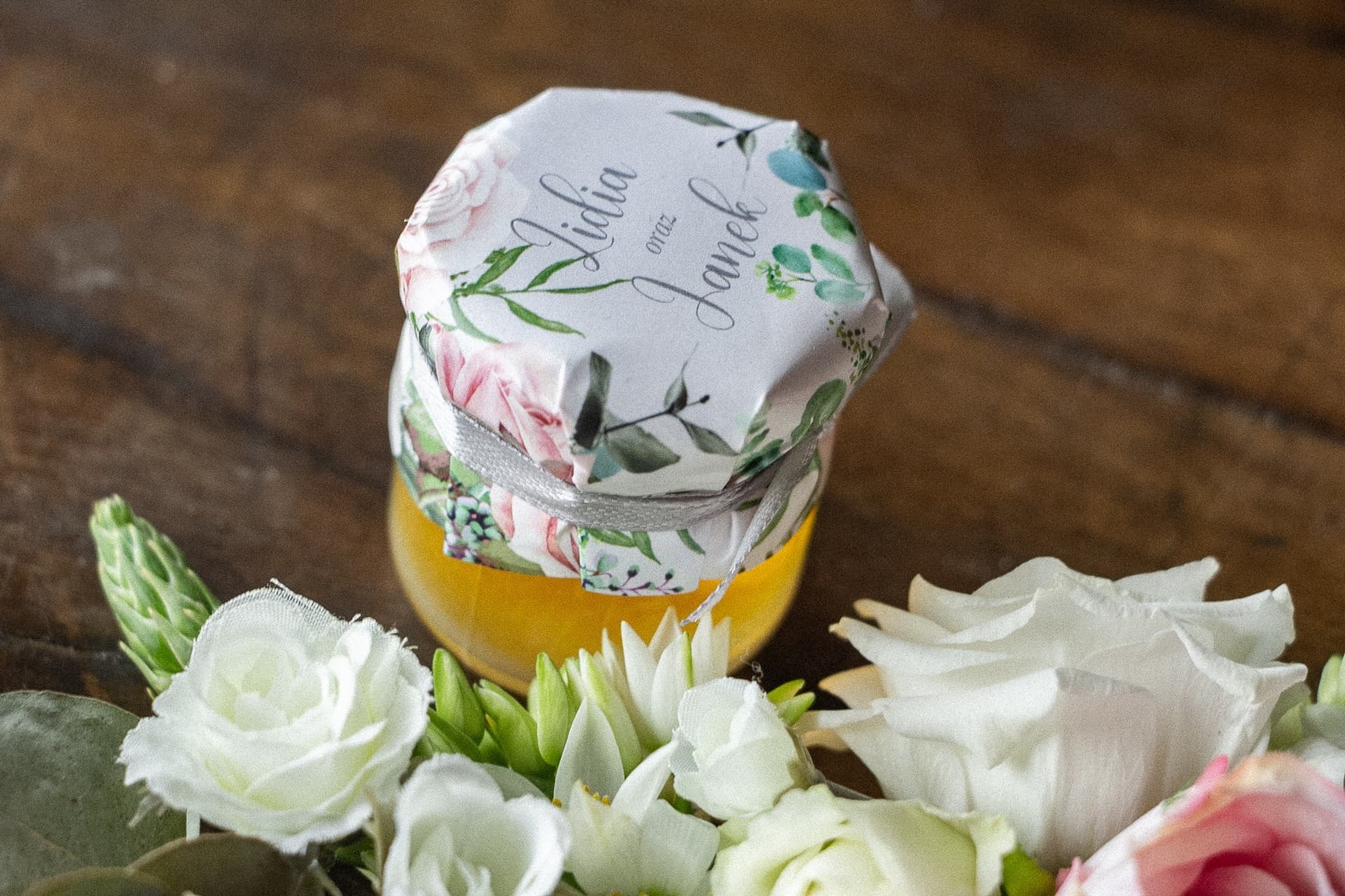 Szukacie wyjątkowych podziękowań dla gości weselnych? Nasze miodki z kolekcji Eteryczne nr 5 to kwintesencja elegancji. Małe, personalizowane słoiczki wypełnione naturalnym polskim miodem, ozdobione subtelną grafiką z pastelowymi różami na szarym tle, zachwycą Waszych bliskich. To słodki i stylowy upominek, który na długo pozostanie w ich pamięci. Sprawcie, by Wasz wielki dzień był doskonały w każdym detalu. Zamówcie spersonalizowane miodki i podziękujcie gościom w najpiękniejszy sposób!