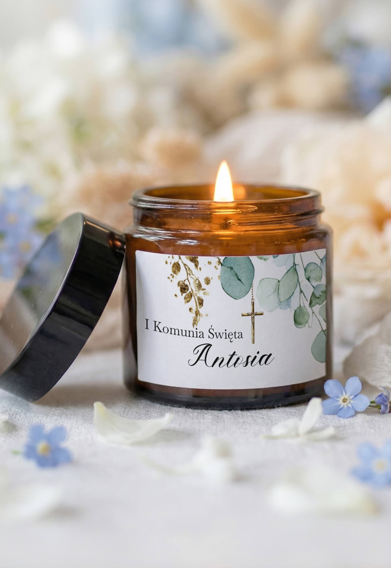 Te świeczki sojowe z personalizowaną etykietą z kolekcji Lukrecja nr 2 to subtelne i eleganckie podziękowanie dla gości z okazji Pierwszej Komunii Świętej. Etykieta zdobiona jest botaniczną grafiką liści eukaliptusa oraz delikatnym symbolem krzyża.