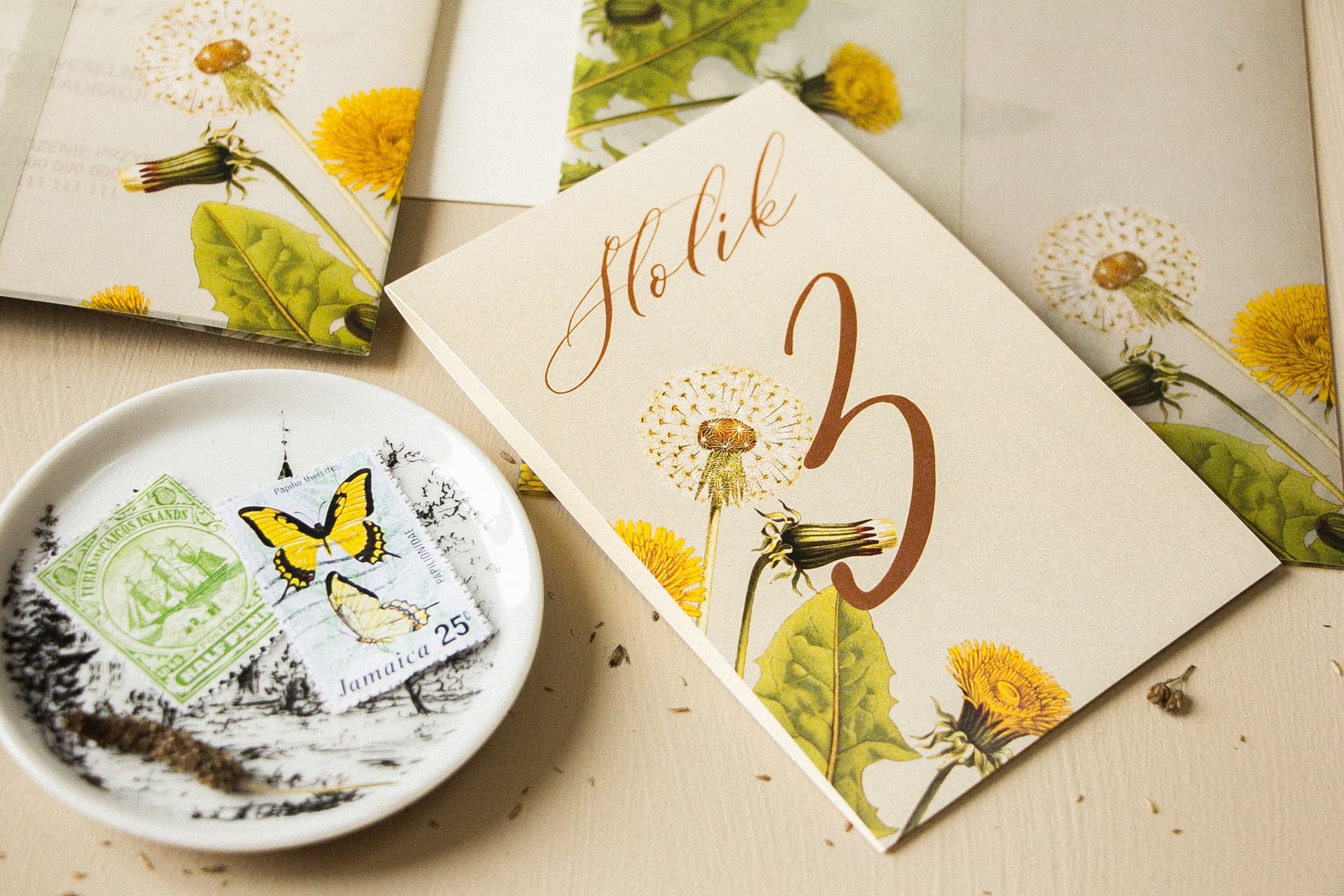 Perfekcyjna organizacja wesela polega na harmonii wszystkich elementów. Dlatego numerki na stół Opal nr 6 to część większej, spójnej kolekcji papeterii ślubnej. Oferujemy możliwość zamówienia w tym samym stylu zaproszeń, winietek, kart menu, planów stołów, zawieszek na alkohol oraz podziękowań dla gości. Wybierając całą serię z motywem dmuchawca, tworzycie przemyślaną i elegancką oprawę wizualną Waszego święta, która zachwyci gości dbałością o detale i z pewnością zostanie przez nich doceniona, co jest kluczowe, aby zadbać o zaproszonych w dniu ślubu, by czuli się wyróżnieni.