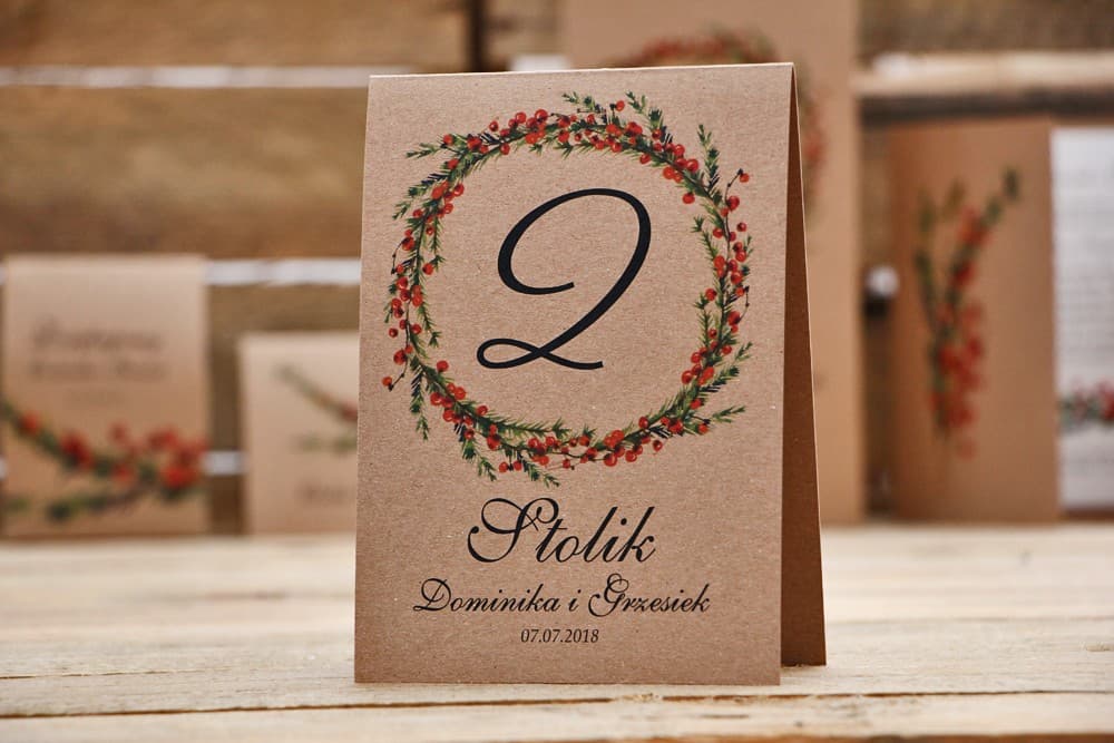 Motyw jarzębiny i świerku na ekologicznym, fakturowanym papierze to strzał w dziesiątkę dla wesel w stylu rustykalnym. Naturalne materiały, leśne inspiracje i niewymuszona elegancja – te numerki doskonale wpisują się w ten klimat. Podobnie w przypadku estetyki boho, gdzie liczy się swoboda i bliskość natury, oraz wesel leśnych, gdzie staną się one oczywistym i pięknym dopełnieniem scenerii.