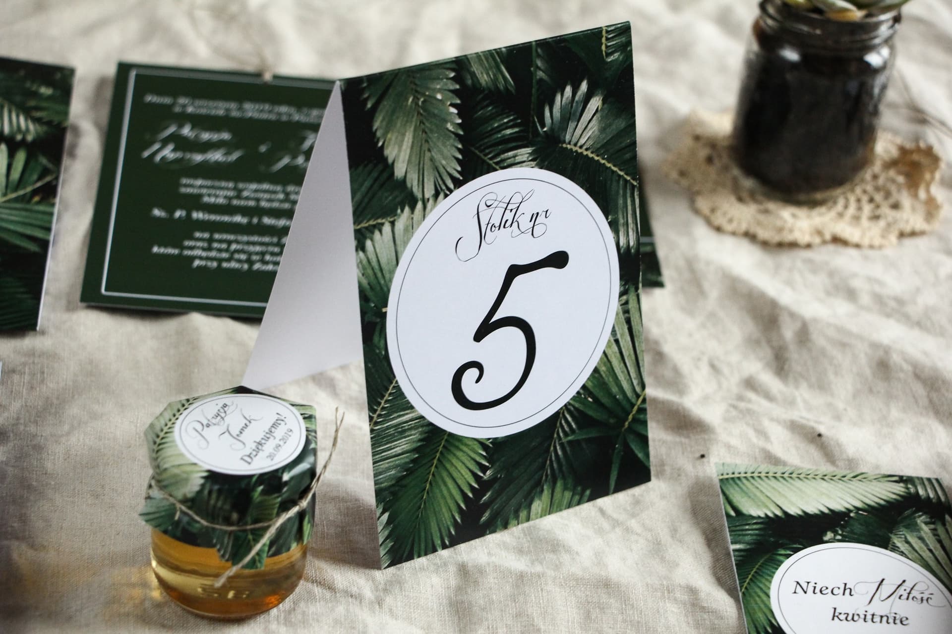 Kolekcja Botanik nr 2 to nie tylko numery stołów. To cała gama papeterii ślubnej, która pozwoli Wam stworzyć w pełni spójną oprawę wizualną uroczystości. Oferujemy zaproszenia ślubne, winietki, menu weselne, zawieszki na alkohol, a nawet podziękowania dla gości – wszystko utrzymane w tym samym, zjawiskowym motywie liści bananowca. Co więcej, w Amelia-Wedding.pl projekt i personalizacja są zawsze w cenie! Nasi graficy (lub nasze innowacyjne AI) przygotują dla Was projekt zgodny z Waszymi wytycznymi, a Wy możecie wprowadzać dowolną liczbę poprawek, aż do uzyskania wymarzonego efektu. Chcecie zmienić czcionkę, układ tekstu, a może potrzebujecie numerów w niestandardowym formacie? Jesteśmy do Waszej dyspozycji. Tworzenie luksusowej atmosfery nie musi wiązać się z ogromnym budżetem. Sprawdź nasze porady na blogu: Jak stworzyć atmosferę luksusu na ślubie z małym budżetem?.