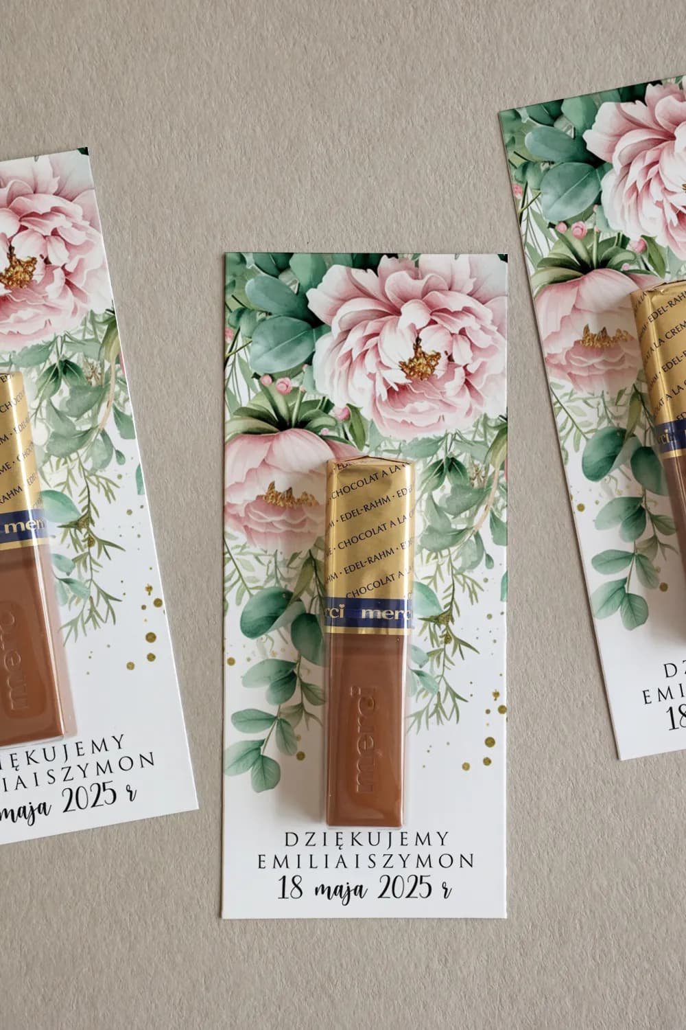 Podaruj gościom słodki gest wdzięczności dzięki naszym personalizowanym podziękowaniom z czekoladką Merci. Każdy bilecik zdobi subtelna grafika pastelowych kwiatów w odcieniach różu i kremu, tworząc romantyczną pamiątkę Waszej uroczystości. To idealny, słodki upominek nie tylko na wesele, ale i inne wyjątkowe okazje. Dzięki darmowej, pełnej personalizacji, dopasujesz tekst do charakteru przyjęcia, czyniąc podziękowania niepowtarzalnymi. Wybierz smak i elegancję, które na długo pozostaną w pamięci Twoich najbliższych. Zamów projekt i zachwyć swoich gości!