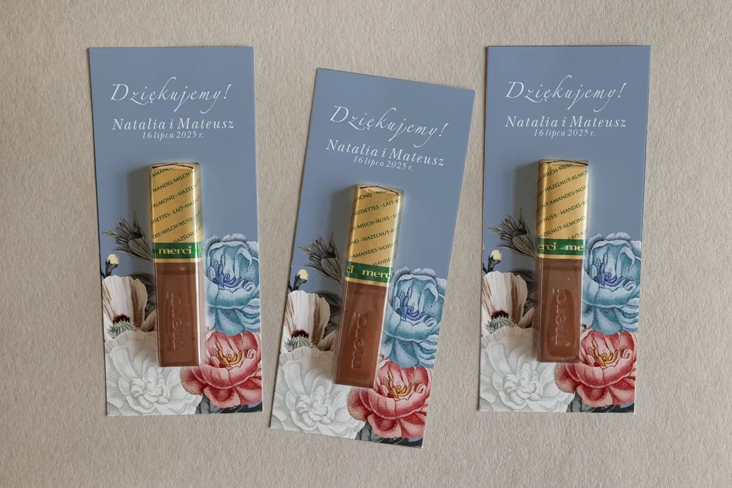 Wyraź wdzięczność w najsłodszy sposób! Nasze podziękowania z czekoladką Merci, ozdobione subtelną, pastelową kompozycją błękitnych i różowych kwiatów, to idealny upominek dla Twoich gości. Elegancki design z kolekcji Eteryczne nr 4 doskonale podkreśli wyjątkowy charakter wesela, chrztu, komunii czy rocznicy. Każde podziękowanie jest w pełni personalizowane, a projekt przygotujemy dla Ciebie całkowicie za darmo. Zaskocz swoich bliskich gustownym detalem, który na długo pozostanie w ich pamięci. Zamów już dziś i dodaj swojej uroczystości odrobinę eterycznej magii!