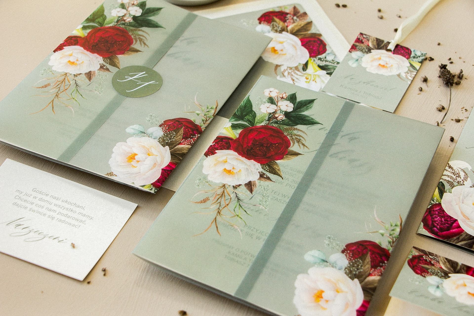 Tym, co wyróżnia kolekcję Opal nr 9, jest zjawiskowa, przezroczysta owijka z nadrukiem delikatnych, pastelowozielonych gałązek. Pełni ona dwojaką funkcję. Po pierwsze, stanowi nowoczesny i niezwykle modny element dekoracyjny, który podnosi prestiż zaproszenia. Po drugie, tworzy efekt subtelnej tajemnicy – gość najpierw widzi kwiatową mgiełkę, a dopiero po jej zdjęciu odkrywa pełną treść zaproszenia. Ten element 'unboxingu' sprawia, że samo otrzymanie zaproszenia staje się małym, ekscytującym doświadczeniem. Jest to też nawiązanie do najnowszych trendów, o których więcej przeczytasz we wpisie o nowoczesnych technologiach na ślubie.