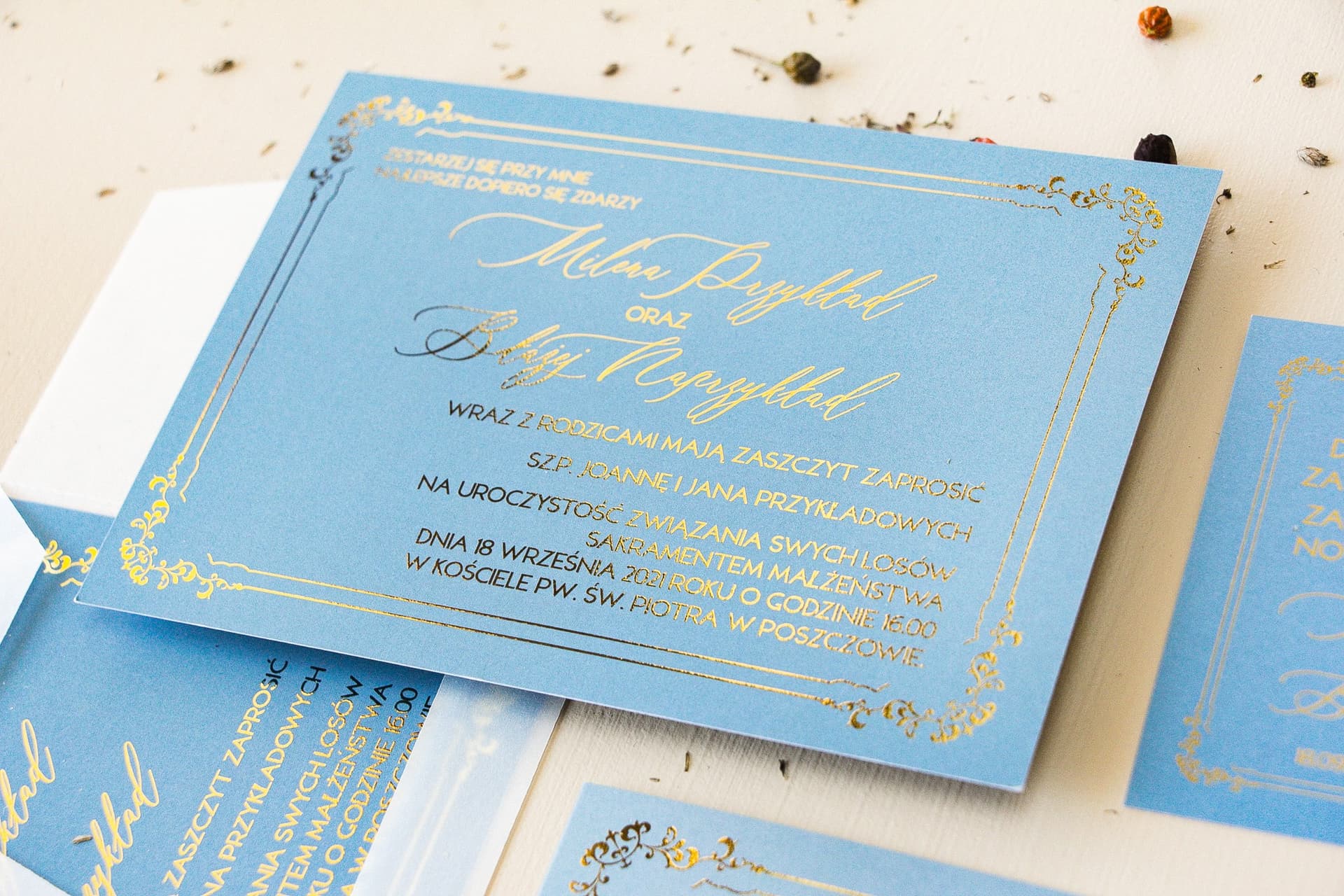 Kolekcja 'Sand' to kwintesencja elegancji i nowoczesnego designu. Próbka zaproszenia nr 1 pozwoli Ci doświadczyć tego połączenia wszystkimi zmysłami. Zwróć uwagę na głęboki, a zarazem subtelny kolor dusty blue – to jeden z najmodniejszych odcieni w branży ślubnej, który doskonale komponuje się z różnorodnymi motywami przewodnimi, od glamour po boho. Poczuj pod palcami wysokiej jakości, gruby papier, który świadczy o klasie i dbałości o detale. Zobacz, jak pięknie mieni się złocona, kaligraficzna czcionka, dodając całości luksusowego charakteru. To właśnie te niuanse, których nie da się w pełni oddać na ekranie monitora, decydują o ostatecznym wrażeniu.