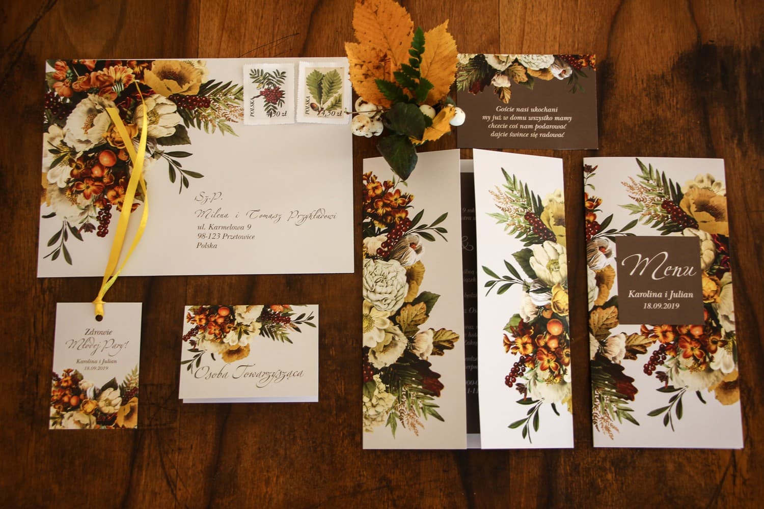 W zestawie znajdziesz kluczowe elementy kolekcji: zaproszenie ślubne, winietkę, zawieszkę, menu, bilecik oraz herbatkę. Do każdego zestawu dołączamy również bon rabatowy o wartości 10 zł na Twoje przyszłe zamówienie w Amelia-Wedding.pl, który pozwoli obniżyć koszt finalnego zamówienia.