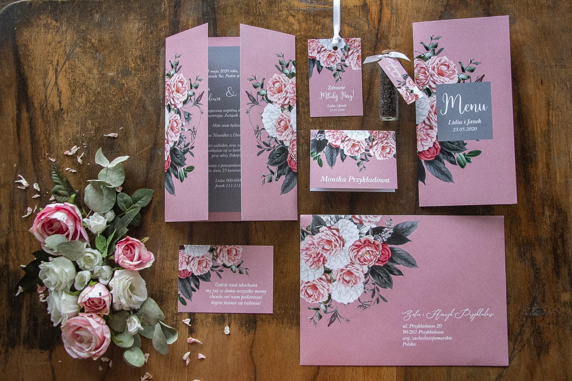 Kolekcja Eteryczne nr 3 to propozycja dla par, które cenią sobie subtelność, romantyzm i nowoczesną elegancję. Motyw przewodni opiera się na delikatnej kompozycji pudrowego różu i stonowanej szarości, tworząc niezwykle lekką i zwiewną całość. To styl, który idealnie wpisuje się w wesela w klimacie rustykalnym, boho, ale także klasycznym. Zamawiając próbki, będziecie mogli zobaczyć, jak te kolory prezentują się w rzeczywistości, w różnym oświetleniu – od naturalnego światła dziennego po ciepłe światło wieczornych lamp. To kluczowe, by upewnić się, że papeteria idealnie dopełni kwiatowe dekoracje i ogólny wystrój sali.