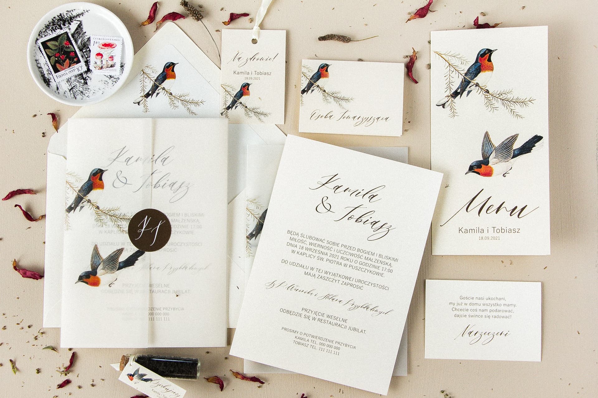 Zastanawiasz się, czy styl retro z kolekcji Opal jest dla Ciebie? Zamów nasz kompletny zestaw próbek i przekonaj się na własne oczy o wyjątkowej jakości papeterii ślubnej od Amelia-Wedding.pl. Poczuj pod palcami fakturę kremowego, perłowego papieru i oceń nasycenie kolorów oraz precyzję druku motywu z ptaszkami. To najlepszy sposób, by bez ryzyka podjąć świadomą decyzję. Zestaw zawiera wszystkie elementy kolekcji, od zaproszenia po dodatki. Zamów próbki już dziś – gwarantujemy ekspresową wysyłkę!
