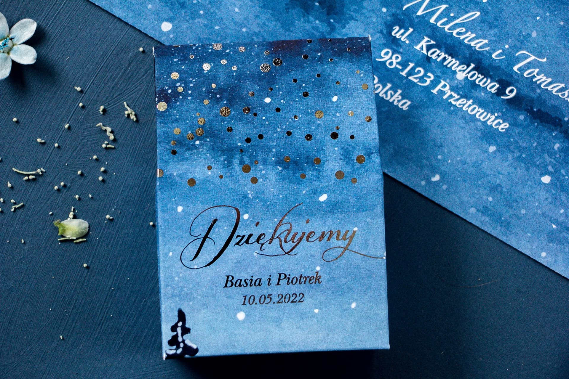 Zamiast standardowego 'Dziękujemy', możecie umieścić na pudełeczku krótki cytat o miłości, fragment piosenki lub osobiste słowa wdzięczności skierowane do gości. To Wy decydujecie o każdym słowie, a my dbamy o to, by całość prezentowała się perfekcyjnie.