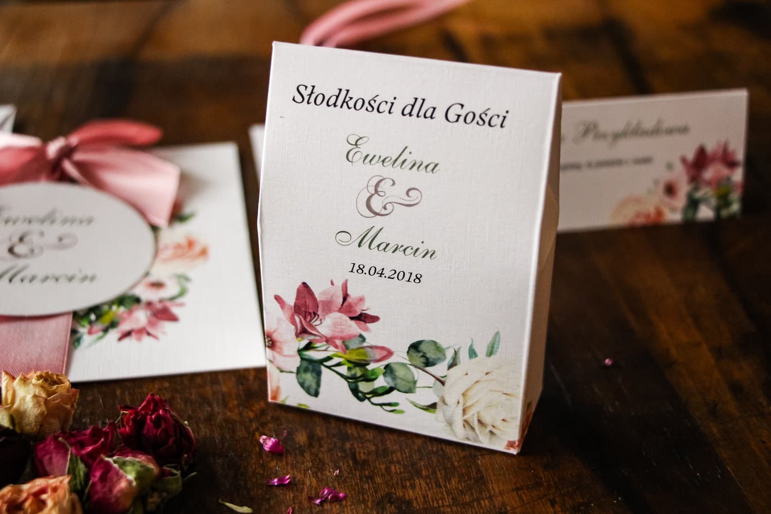 Kolekcja Akwarele nr 27 to nie tylko pudełeczka na podziękowania. Oferujemy całą gamę papeterii ślubnej utrzymanej w tym samym, romantycznym stylu. Możecie zamówić zaproszenia ślubne, winietki na stoły, zawieszki na alkohol, numery stołów czy plany usadzenia gości z tym samym motywem akwarelowych kwiatów. Stworzenie spójnej oprawy wizualnej wesela świadczy o dbałości o detale i sprawia, że cała uroczystość nabiera niezwykle eleganckiego i profesjonalnego charakteru. Połączenie kwiatowych dekoracji sali z dopasowaną papeterią stworzy niezapomnianą atmosferę, o której marzy każda para młoda. Zainspirujcie się najnowszymi trendami florystycznymi na naszym blogu: Florystyka na czasie: trendy w bukietach ślubnych i dekoracjach kwiatowych 2025.
