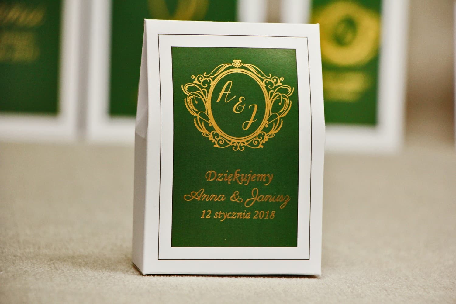 Szukacie eleganckich podziękowań dla gości, które na długo zapadną w pamięć? Odkryjcie nasze pudełeczka z kolekcji Sonata w kolorze głębokiej, butelkowej zieleni i złota. Wewnątrz każdego z nich znajdują się pyszne karmelki, a złocone, personalizowane napisy dodają całości luksusowego charakteru. To gotowy, piękny upominek, który wyrazi Waszą wdzięczność w wyjątkowym stylu. Zamówcie i sprawcie radość swoim bliskim!