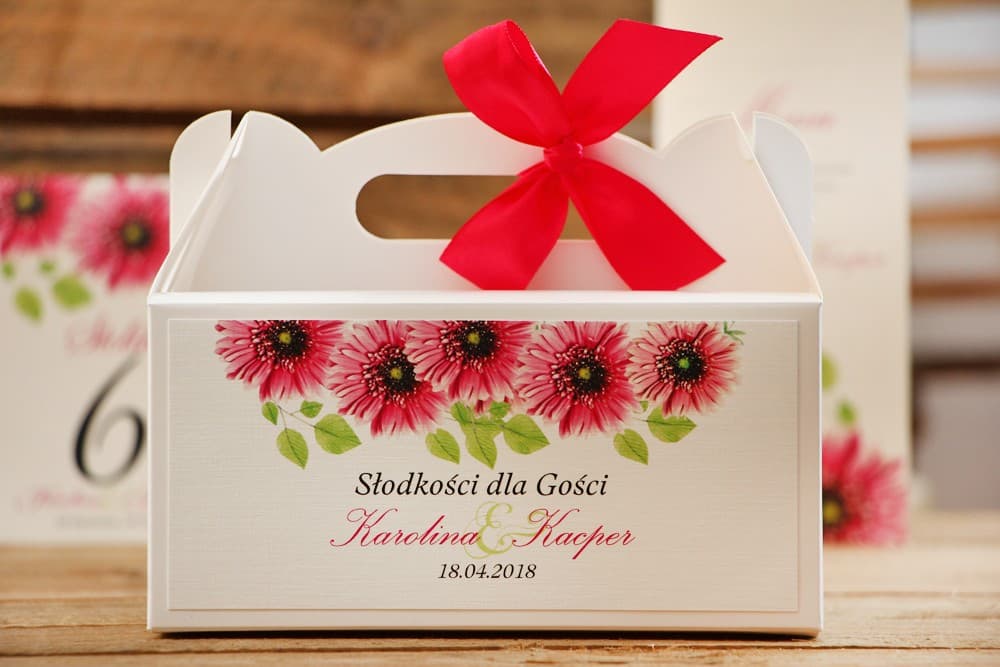 Motyw przewodni wesela to klucz do spójnej i zachwycającej aranżacji. Delikatny, akwarelowy wzór różowych gerber na naszych pudełkach doskonale komponuje się z różnymi stylami – od romantycznego, przez boho, aż po klasyczną elegancję. Amarantowa kokardka dołączona do zestawu stanowi kropkę nad "i", dodając całości odrobiny koloru i szyku. Pamiętajcie, że spójność wizualna jest niezwykle ważna, a takie detale jak opakowania na ciasto mogą wspaniale uzupełnić wygląd zaproszeń, winietek czy menu. Aby dowiedzieć się więcej o tym, jak zadbać o spójność stylu zaproszeń z dekoracją weselną, zajrzyjcie na naszego bloga.