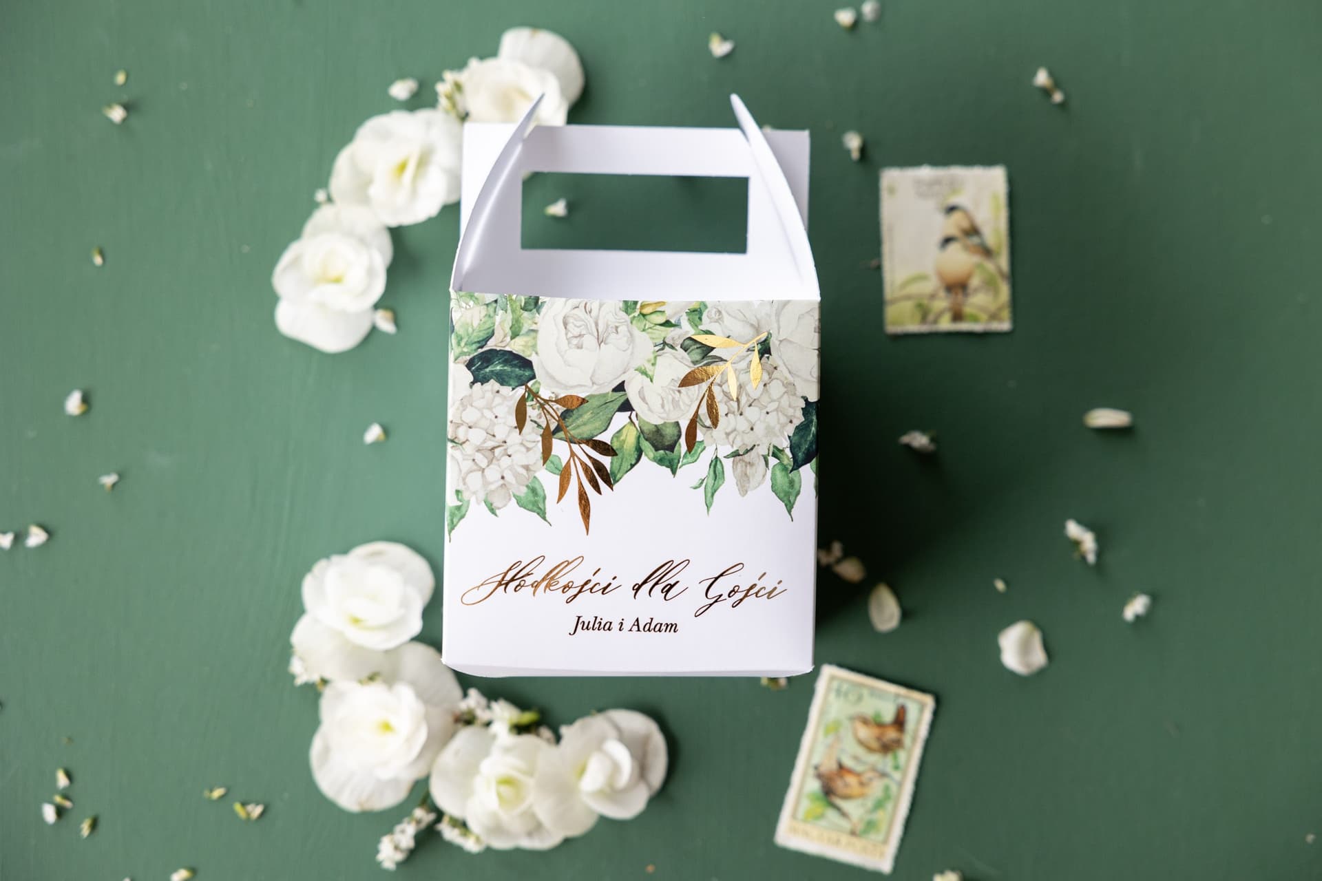 Motywem przewodnim kolekcji Rubin nr 11 jest subtelna kompozycja graficzna przedstawiająca bukiet białych piwonii, otulonych zielonymi listkami. Piwonie od wieków symbolizują miłość, szczęście i pomyślność, co czyni je idealnym kwiatem na uroczystość ślubną. Prawdziwą gwiazdą tego projektu są jednak lśniące, złocone gałązki, które delikatnie przeplatają się z kwiatowym wzorem. Zastosowanie techniki hot-stampingu (prawdziwego złocenia) sprawia, że detale te pięknie odbijają światło, nadając pudełku trójwymiarowości i prestiżowego charakteru. To właśnie te szczegóły sprawiają, że pudełko przestaje być tylko opakowaniem, a staje się małym dziełem sztuki.