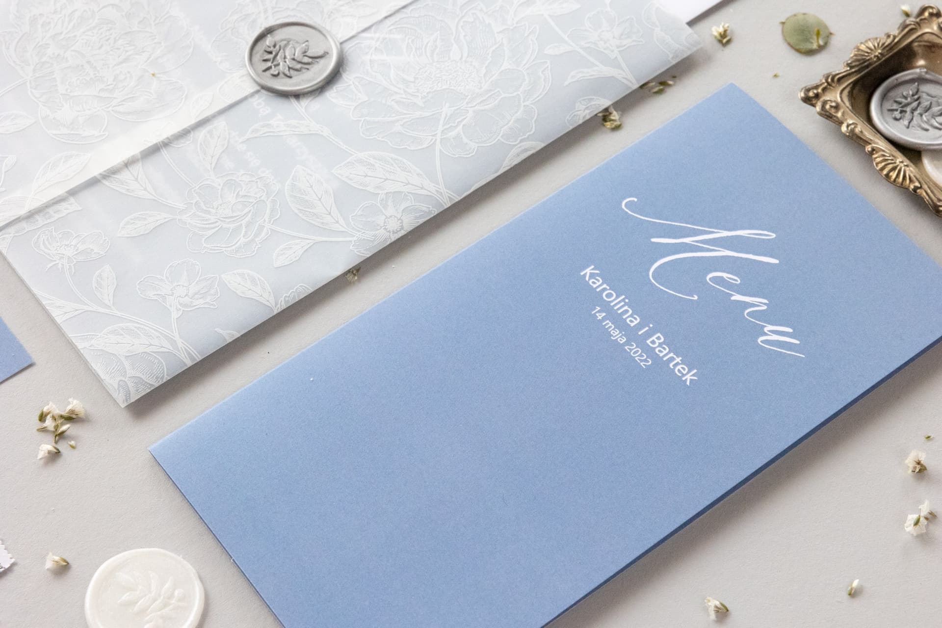 Menu weselne to dopiero początek. Cała kolekcja Nefryt została stworzona z myślą o parach, które marzą o weselu dopracowanym w każdym detalu. W identycznym stylu dusty blue oferujemy eleganckie zaproszenia ślubne, winietki personalizowane, stylowe numery na stoły, zawieszki na alkohol, plany stołów oraz wyjątkowe podziękowania dla gości. Wybierając zestaw papeterii z jednej kolekcji, zyskujesz pewność, że cała oprawa wizualna Twojego dnia będzie harmonijna, luksusowa i zapadająca w pamięć. To najprostszy sposób, by osiągnąć efekt 'wow' i pokazać gościom, jak ważna jest dla Was estetyka. Jeśli zastanawiasz się, jak idealnie zaplanować logistykę tego dnia, nasz artykuł o organizacji transportu dla gości może okazać się cenną wskazówką.