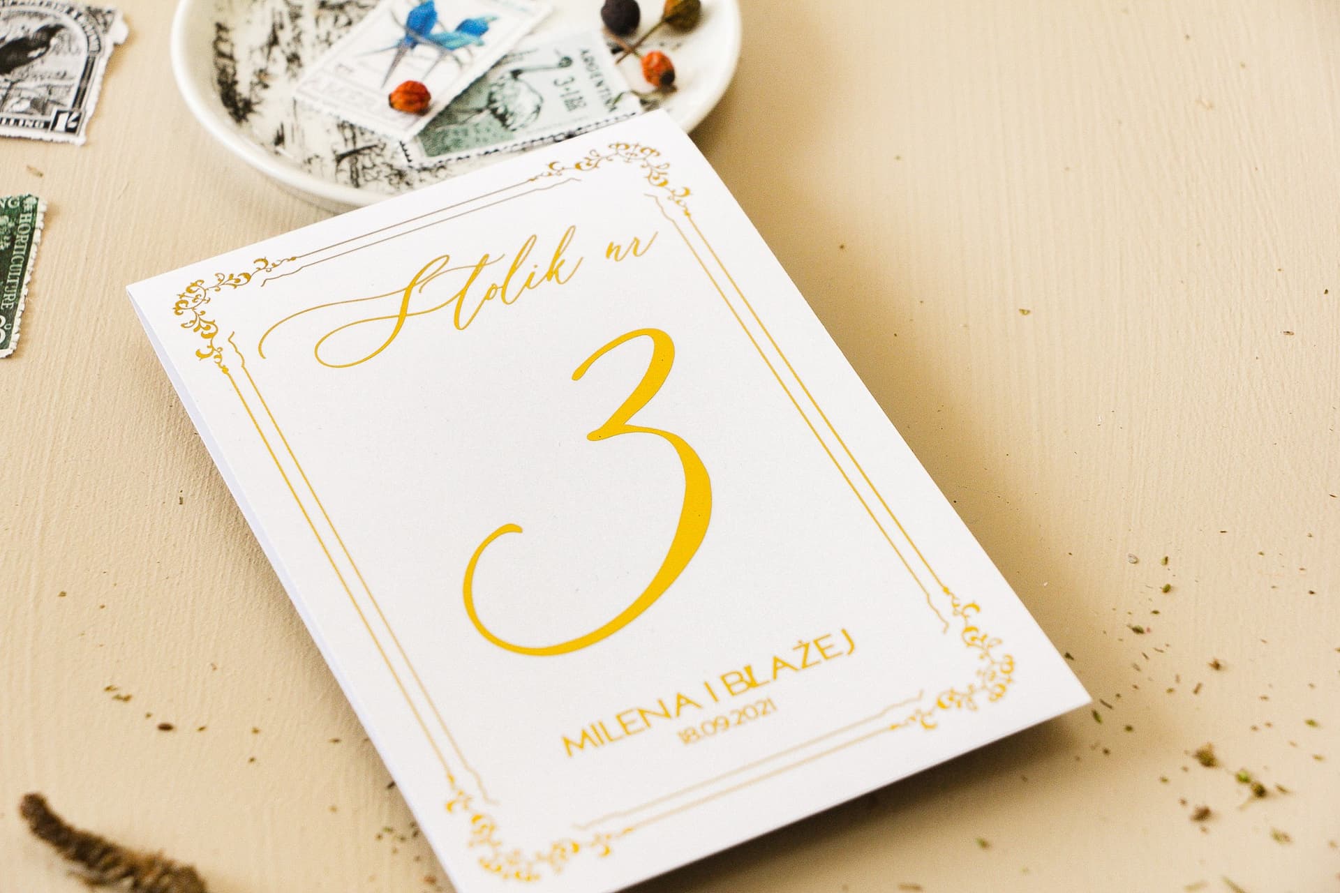 Numerki z kolekcji Sand nr 4 to produkt premium, stworzony z myślą o najbardziej wymagających. Do ich produkcji wykorzystujemy gruby, sztywny papier satynowy o gramaturze 280g w nieskazitelnym, białym kolorze. Jego gładka powierzchnia idealnie eksponuje największy atut numerków – subtelne, złocone detale. Złocenie, wykonane z najwyższą precyzją, pięknie odbija światło, dodając całej kompozycji luksusowego charakteru. Numerki mają praktyczny, stojący format A6 (składane do wymiarów ok. 10,5 x 14,8 cm), dzięki czemu są doskonale widoczne, ale nie przytłaczają aranżacji stołu.
