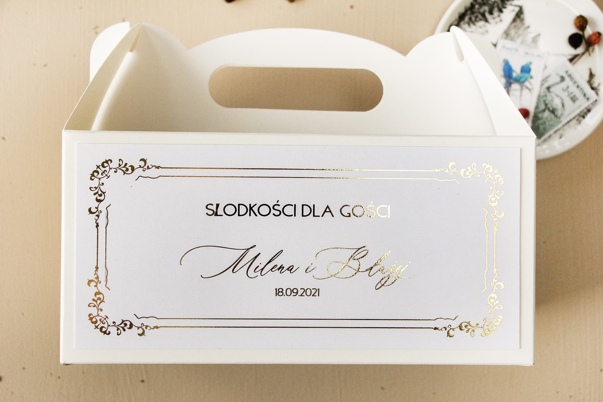 Podaruj gościom słodkie wspomnienie w wyjątkowej oprawie. Nasze prostokątne, białe pudełka na ciasto weselne ze złoconymi napisami to kwintesencja stylu glamour. Stanowią idealne, luksusowe podziękowanie dla gości. Wykonane z grubego, atestowanego kartonu 300g, gwarantują bezpieczeństwo słodkości. Proste w składaniu i wyposażone we wzmacniającą wkładkę, są nie tylko piękne, ale i praktyczne. Zamów w Amelia-Wedding.pl i zachwyć swoich bliskich spersonalizowanym detalem, którego projekt otrzymasz gratis!