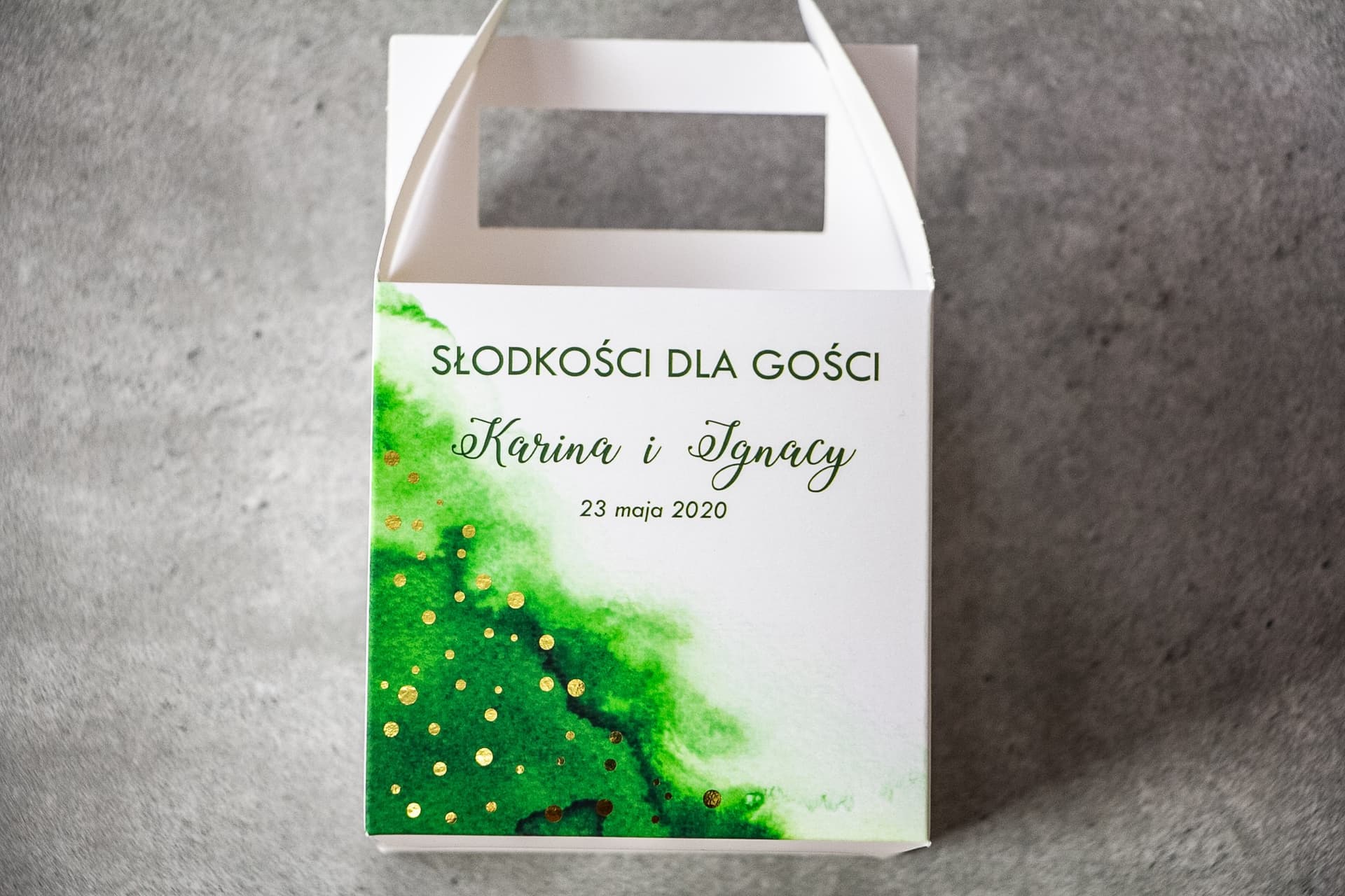 Szukacie wyjątkowych pudełek na ciasto weselne, które zachwycą Waszych gości? Nasze kwadratowe opakowania z subtelną, akwarelową grafiką zielonych gałązek i złoconymi kropeczkami to idealny wybór. Każde pudełko jest personalizowane, posiada wygodny uchwyt i certyfikowany papier, stanowiąc piękne podziękowanie dla gości. Podarujcie bliskim słodkości w najpiękniejszej oprawie. Zamówcie już dziś i skorzystajcie z darmowego projektu, by stworzyć niezapomnianą pamiątkę z Waszego wyjątkowego dnia!