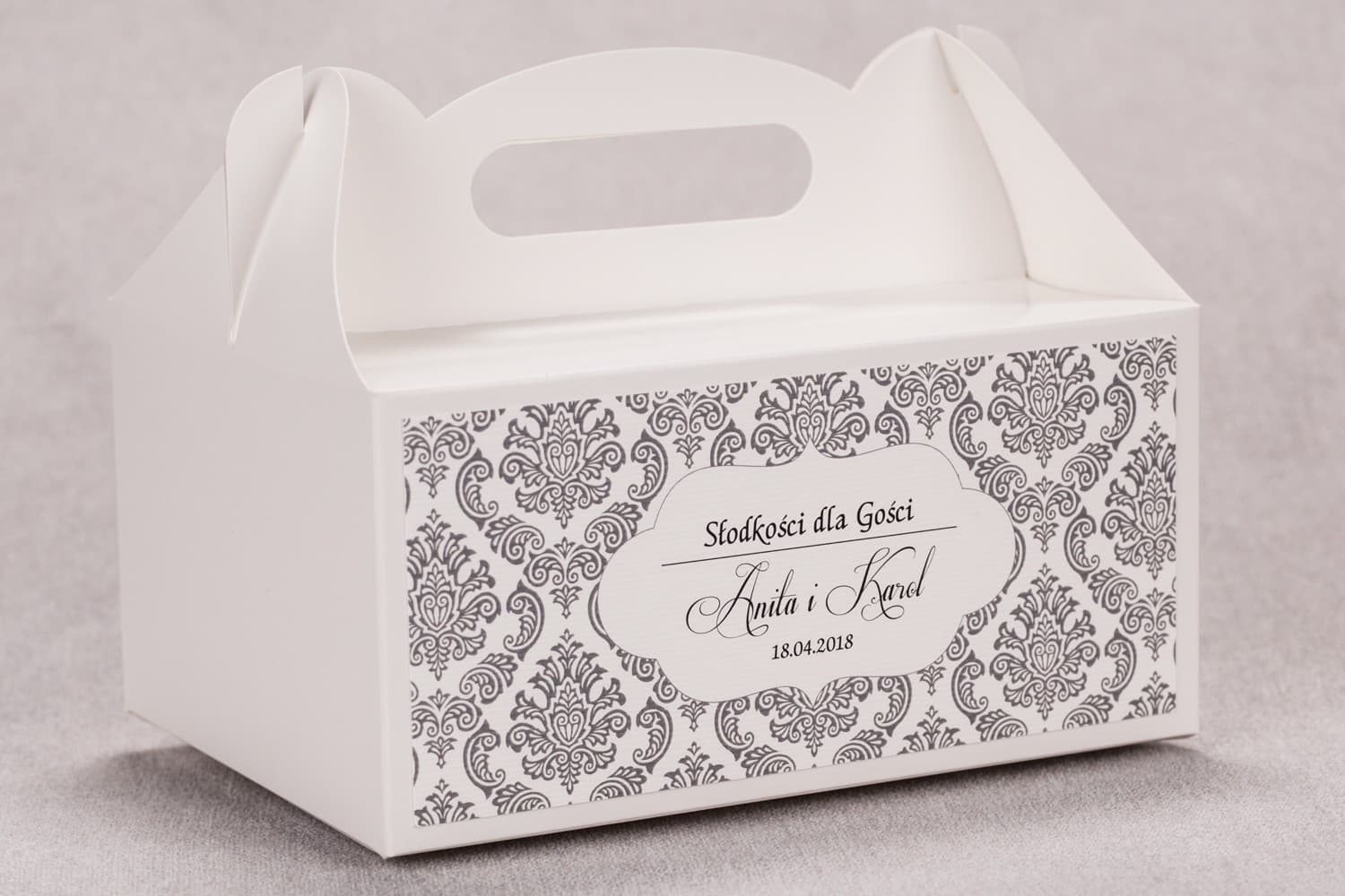 Szukasz idealnego sposobu, by podziękować gościom? Nasze prostokątne pudełko na ciasto weselne z kolekcji Madras to kwintesencja elegancji i dobrego smaku. Subtelny wzór z szarymi ornamentami na wysokiej jakości kartonie idealnie przechowa słodkie upominki. Dzięki pełnej personalizacji i wygodnej rączce, stworzysz niezapomniane podziękowanie, które zachwyci Twoich bliskich. Zamów już dziś i spraw, by ten mały gest został w pamięci na długo!