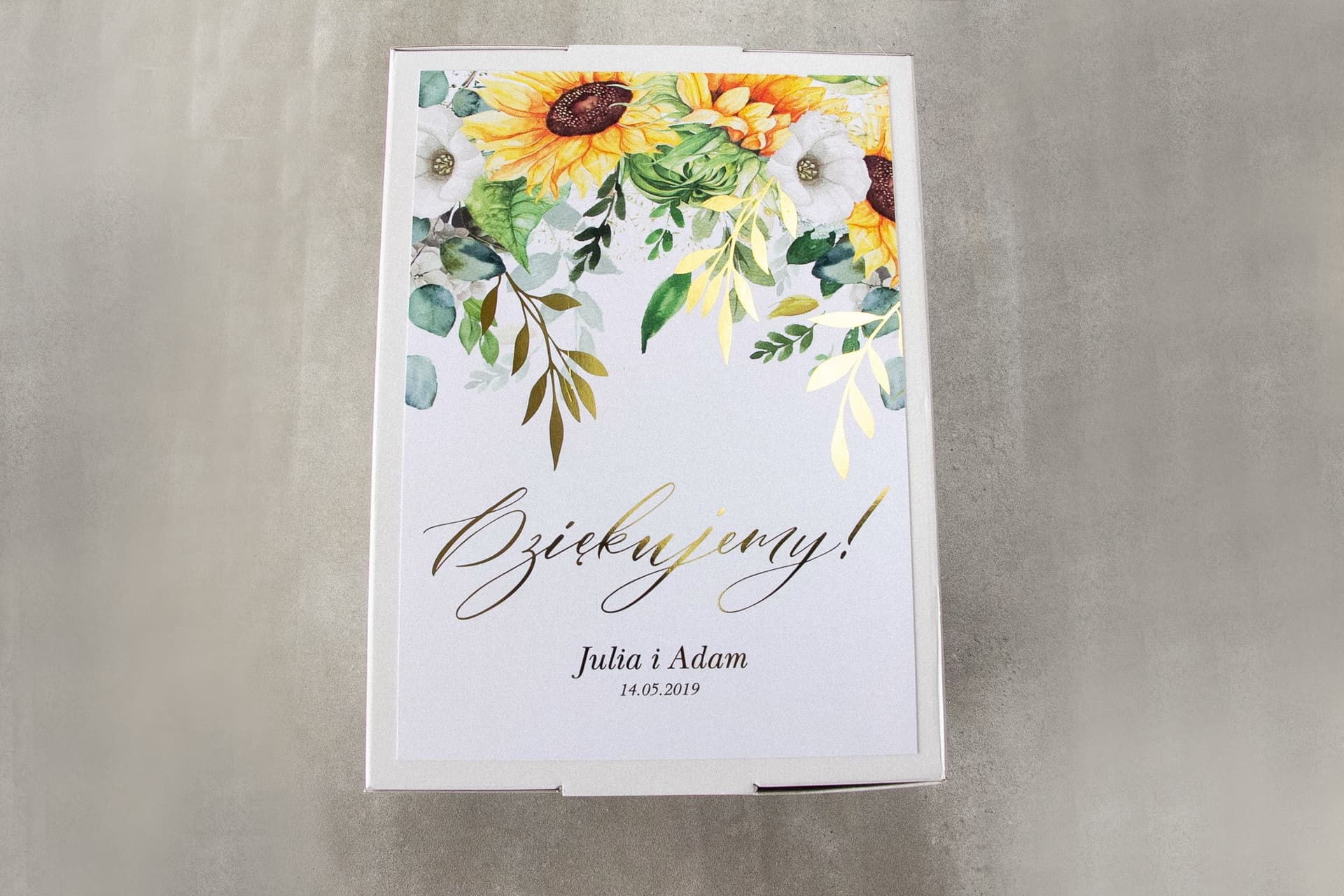 Stwórz unikalne, personalizowane pudełko na koperty ze słonecznikami. Skorzystaj z darmowego projektu i nieograniczonej liczby poprawek, aby stworzyć idealny dodatek na Wasze wesele.