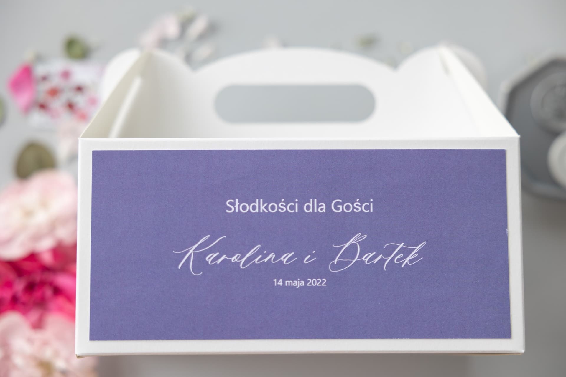 Spersonalizujcie Wasze fioletowe pudełka na ciasto weselne w naszym kreatorze online. Pełna dowolność tekstu i nielimitowane, darmowe poprawki to u nas standard!
