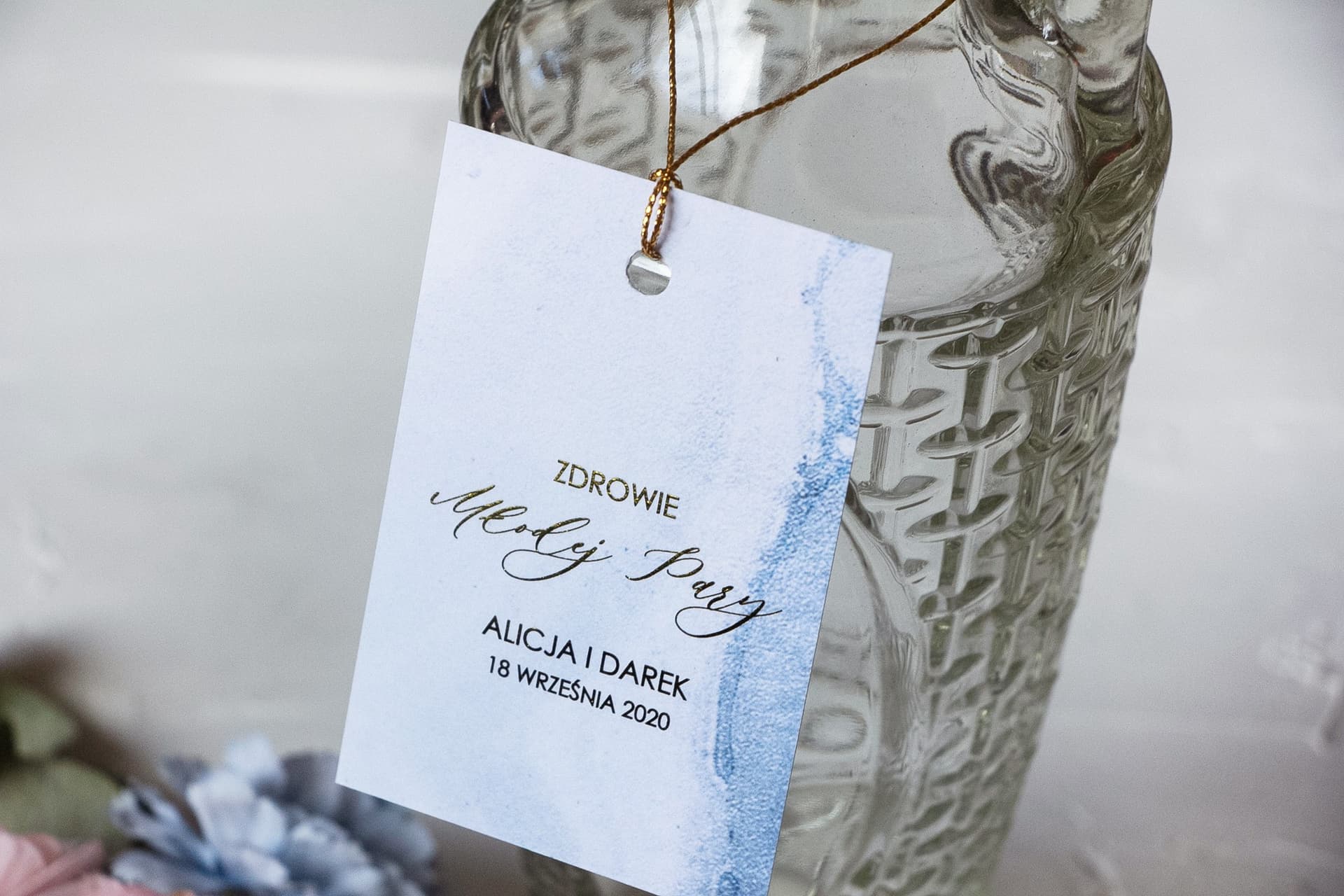 Design naszych zawieszek został starannie przemyślany. Abstrakcyjny, niebieski wzór marmurkowy jest unikalny na każdej zawieszce, co sprawia, że nie ma dwóch identycznych egzemplarzy – zupełnie jak płatki śniegu. Ten artystyczny motyw stanowi doskonałe tło dla prawdziwego złocenia, które aplikujemy z najwyższą precyzją. To nie jest zwykły nadruk – to lśniąca, metaliczna folia, która pięknie odbija światło, dodając butelkom weselnym blasku i prestiżu. Całość dopełnia elegancki złoty sznureczek, który pozwala w prosty sposób przymocować zawieszkę do szyjki butelki. Każdy, kto weźmie ją do ręki, poczuje jej jakość dzięki grubemu papierowi satynowemu (280g) i aksamitnej w dotyku folii SoftTouch.