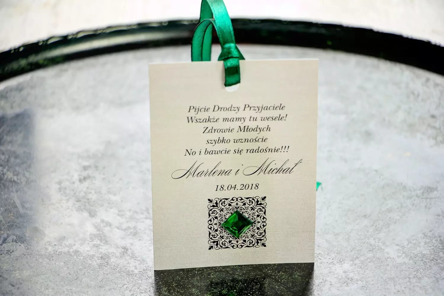 Zawieszki na wódkę weselną Brenet nr 3 to element większej, ekskluzywnej kolekcji papeterii. Planując dekoracje, warto zadbać o ich spójność. Dzięki kolekcji Brenet możecie w tym samym, eleganckim stylu zamówić winietki na stół, numery stołów, menu weselne, a nawet zaproszenia ślubne. Taka konsekwencja wizualna tworzy wrażenie luksusu i przemyślanej koncepcji, co z pewnością zostanie docenione przez gości. Stworzenie takiej atmosfery wcale nie musi być kosztowne, o czym więcej przeczytacie na naszym blogu w artykule "Jak stworzyć atmosferę luksusu na ślubie z małym budżetem?".
