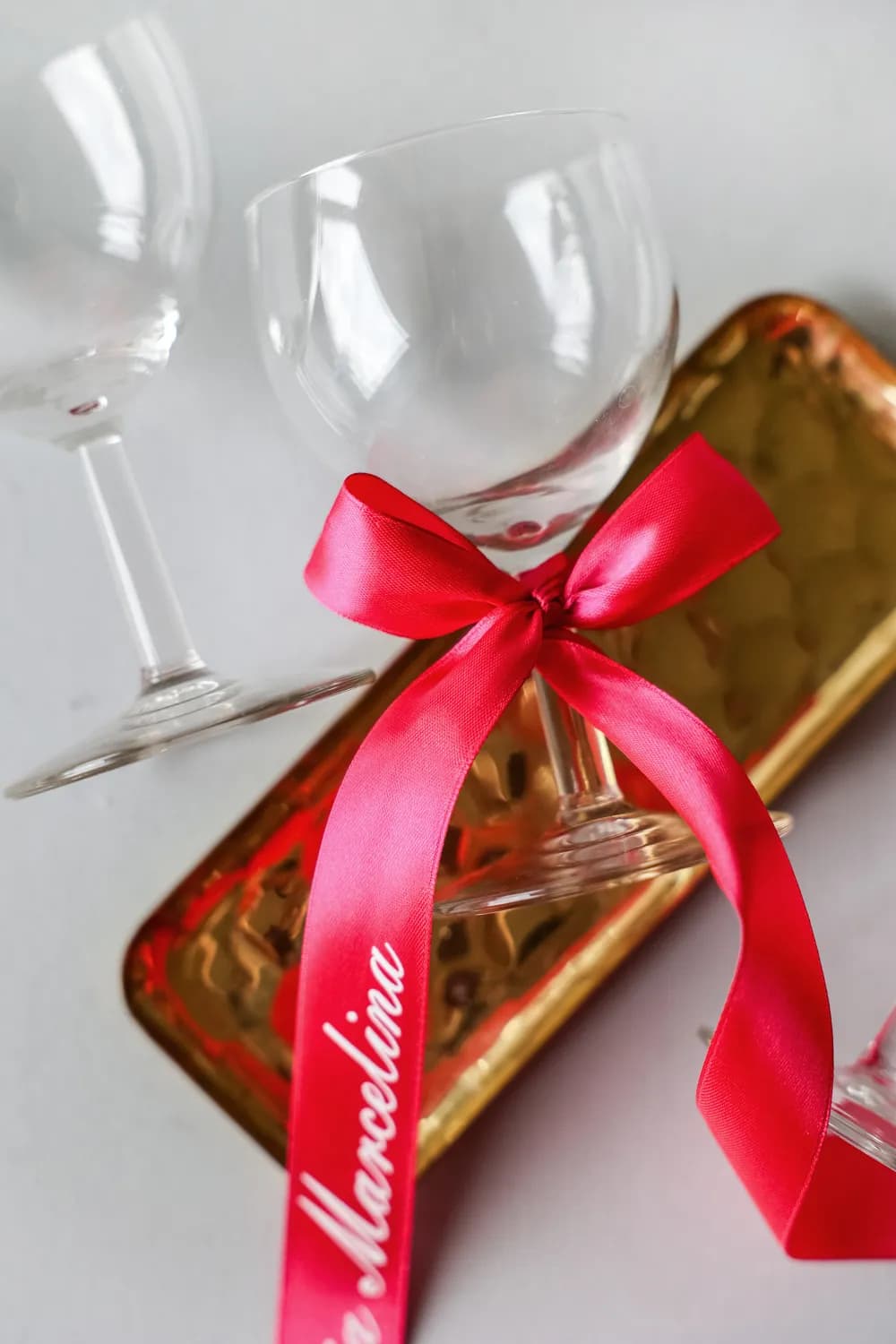 To proste! Długość 1 metra jest optymalna do stworzenia pięknej kokardy. Najpierw owińcie wstążkę wokół nóżki kieliszka. Następnie zróbcie dwie pętelki (uszy) i skrzyżujcie je, przekładając jedną pod drugą, tak jak przy wiązaniu sznurówek. Delikatnie zaciśnijcie supeł, jednocześnie modelując i wyrównując pętelki oraz zwisające końce. Satyna jest materiałem plastycznym, więc z łatwością nadacie jej pożądany, elegancki kształt.
